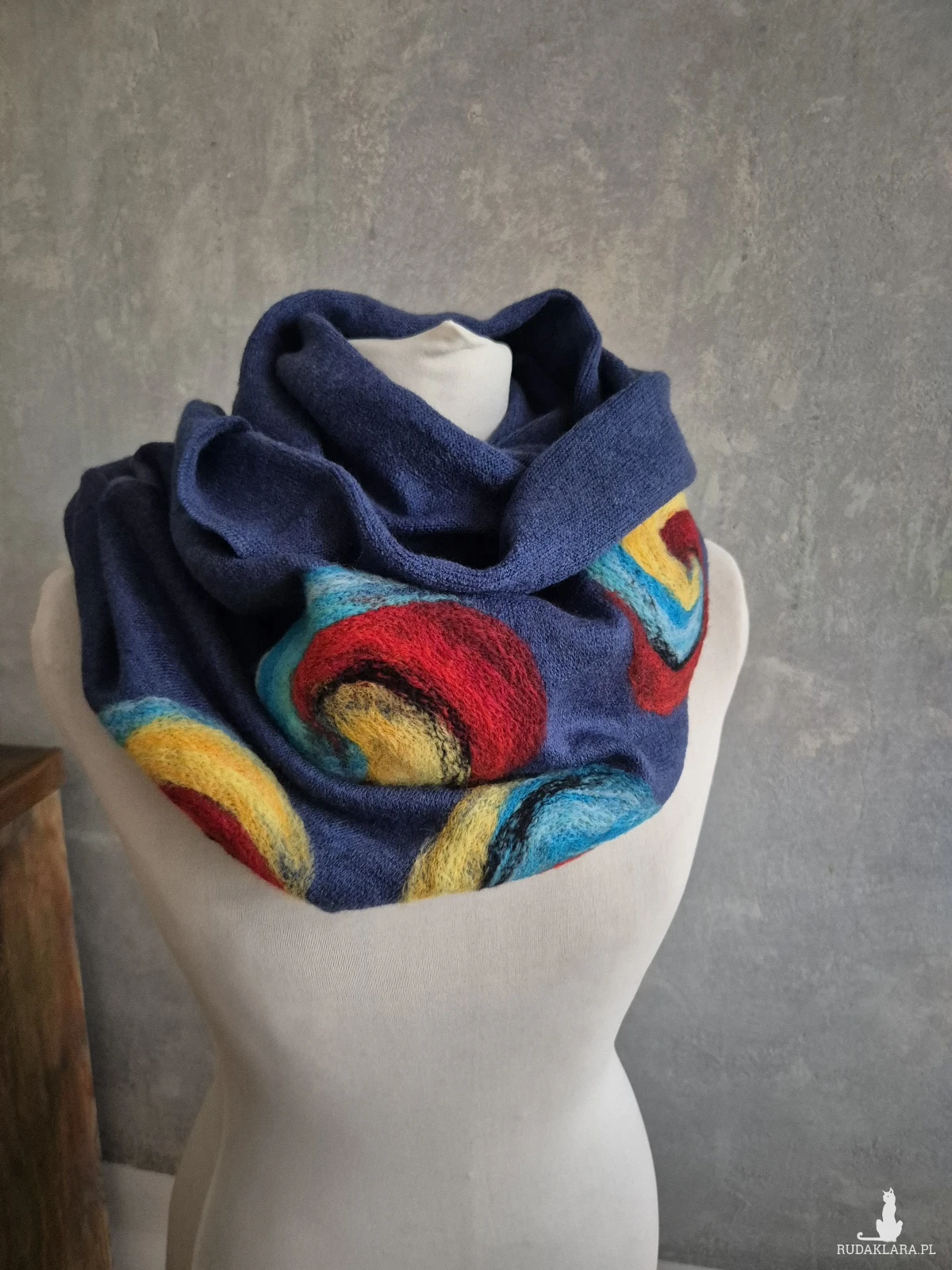 Super prezent na dzień mamy niebieski filcowany wełniany miły i ciepły komin handmade, zdjęcie trochę przekłamuje kolor ten granat jest bardziej podobny do jeansu tak jak na zdjęciu dołączonym przykładowym- tuba, owijany dwa razy, filcowany wełną merynosów, bardzo ciepły i miły, doskonały na prezent, fantastyczny na codzienne noszenie, zwraca uwagę, dodaje koloru, nie zginiesz w tym kominie na ulicy, pojedyncze egzemplarze, polecam bestseller,czas oczekiwania tydzien