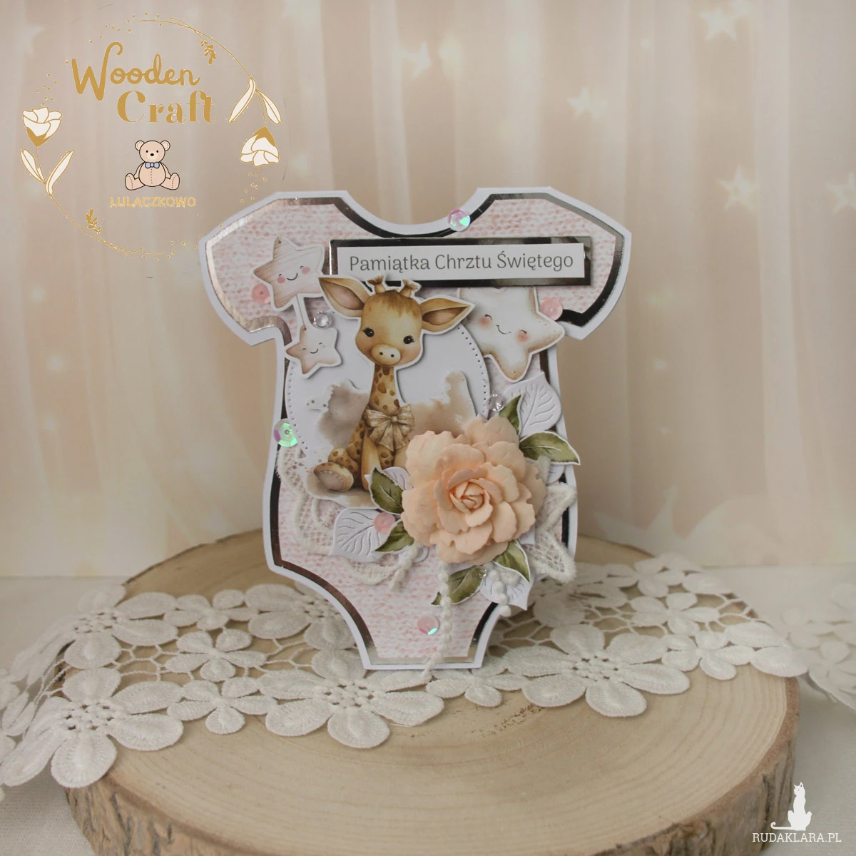 Urocza i nietuzinkowa kartka z okazji Chrztu Świętego, w kształcie dziecięcego body, wykonana z mixu dziecięcych kolekcji papierów, utrzymana w odcieniach bieli, beżu i delikatnego, pudrowego różu, z dodatkiem błyszczących, srebrnych akcentów. Kartka wykonana ręcznie z dbałością o każdy szczegół. Na środku znajduje się grafika słodkiej żyrafki, ozdobiona kompozycją kwiatową z ręcznie robioną różyczką, dodatkowo zdobiona grafikami gwiazdki, balonika i prezentu, kryształkami oraz połyskującymi cekinami, a także napisem "Pamiątka Chrztu Świętego" (na życzenie mogę dodać również imię dziecka, bądź całkowicie zmienić napis na dowolny - w zależności od okazji).