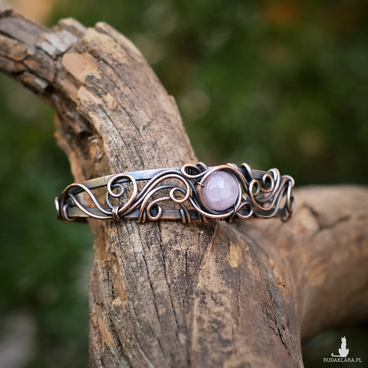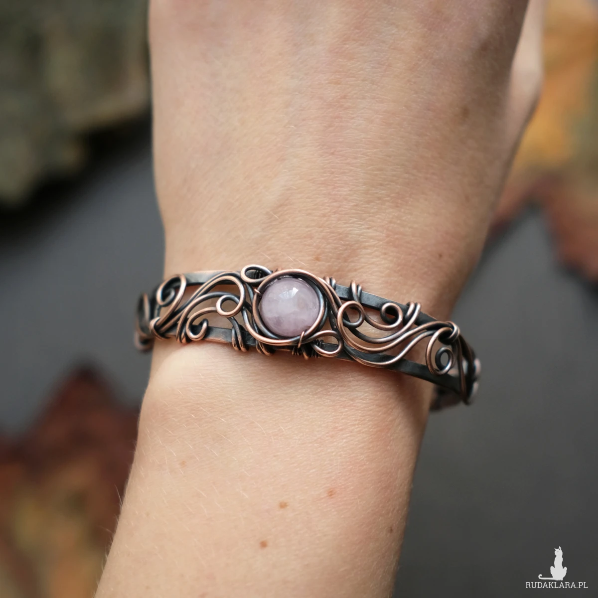 Miedziana bransoletka w elfickim stylu mieści w sobie kamień kunzytu. Oplatają ją sploty miedzianego drutu nadające baśniowego klimatu.