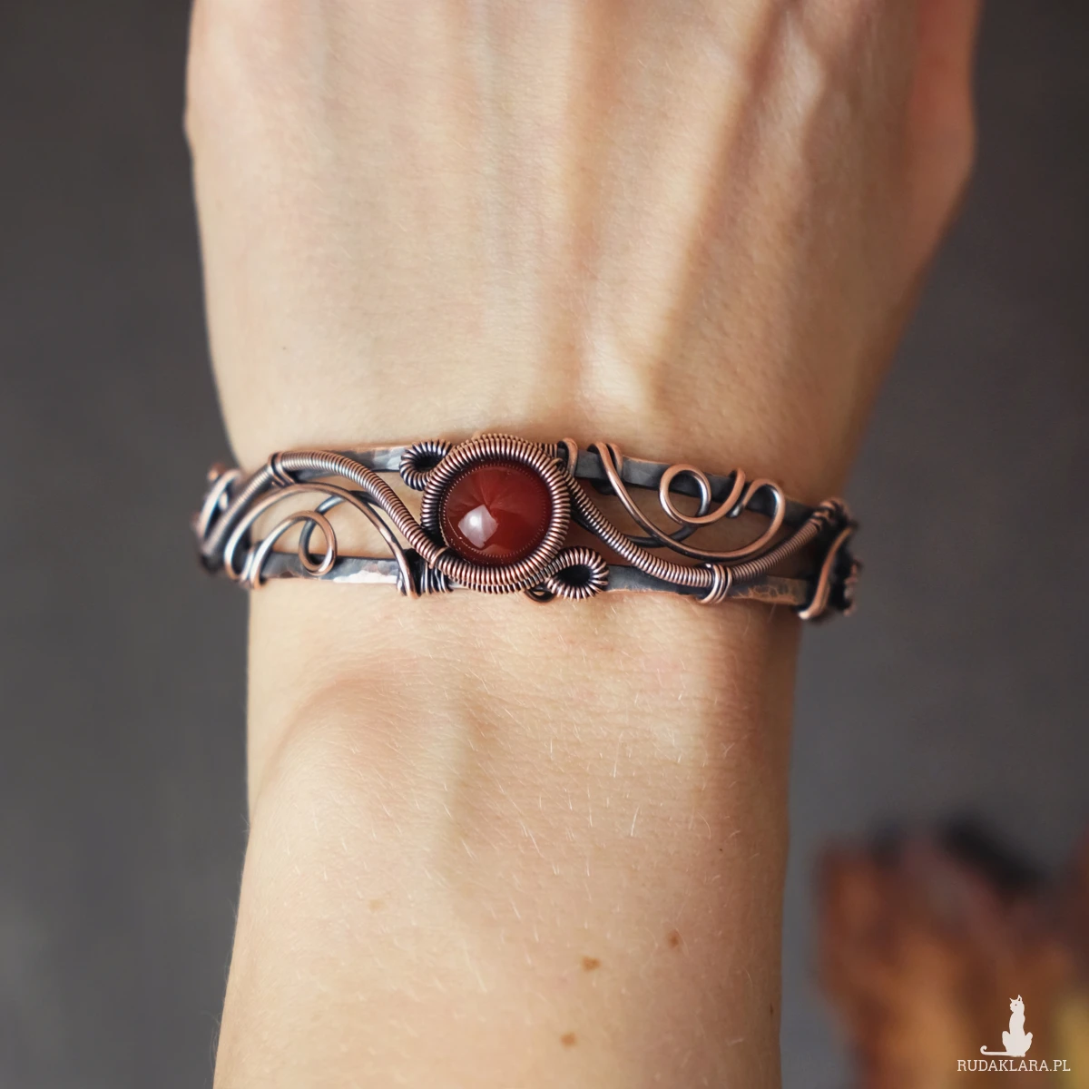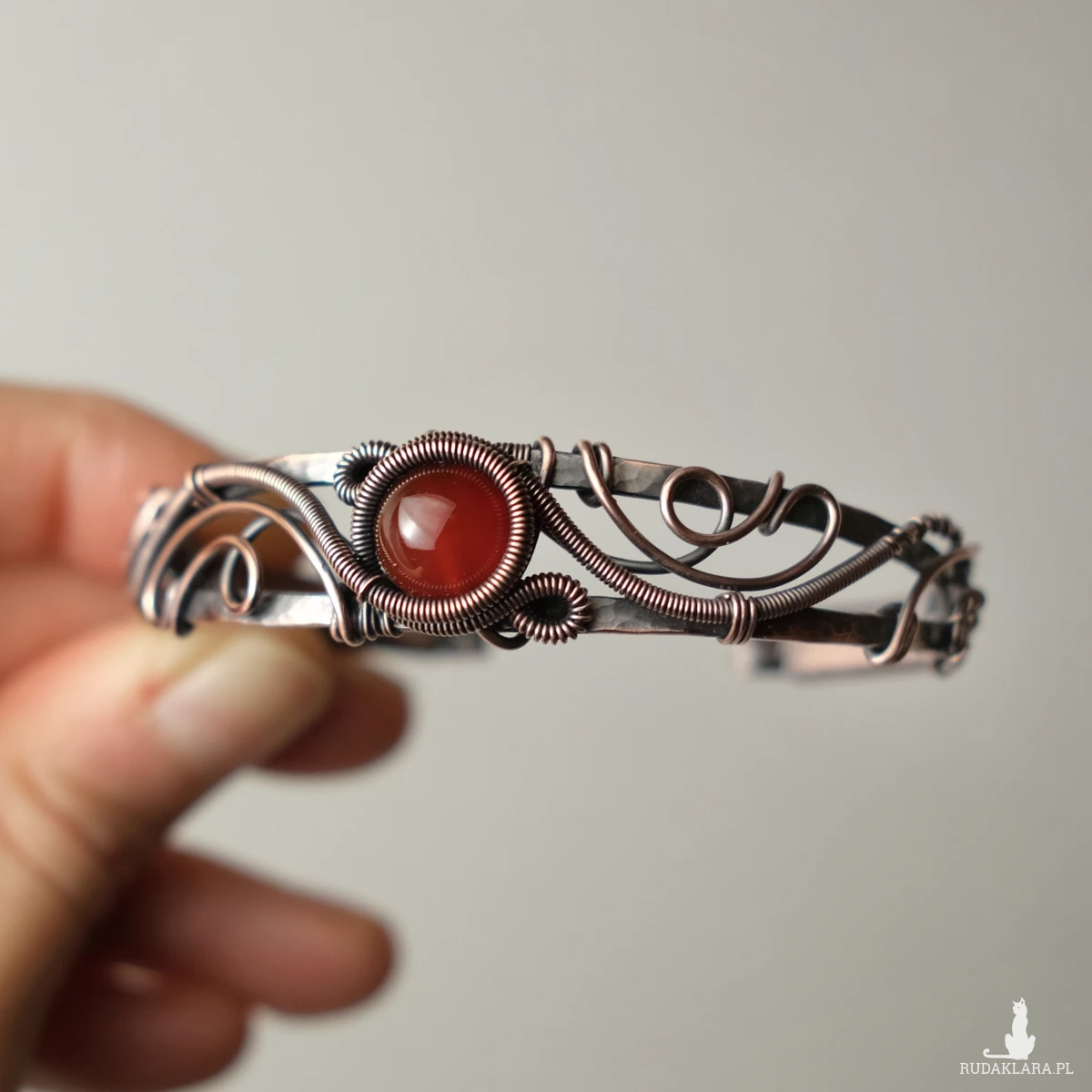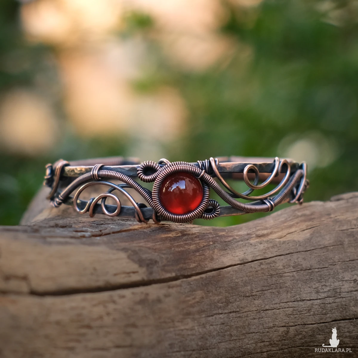 Miedziana bransoletka w elfickim stylu mieści w sobie kamień karneolu. Oplatają ją sploty miedzianego drutu nadające baśniowego klimatu.