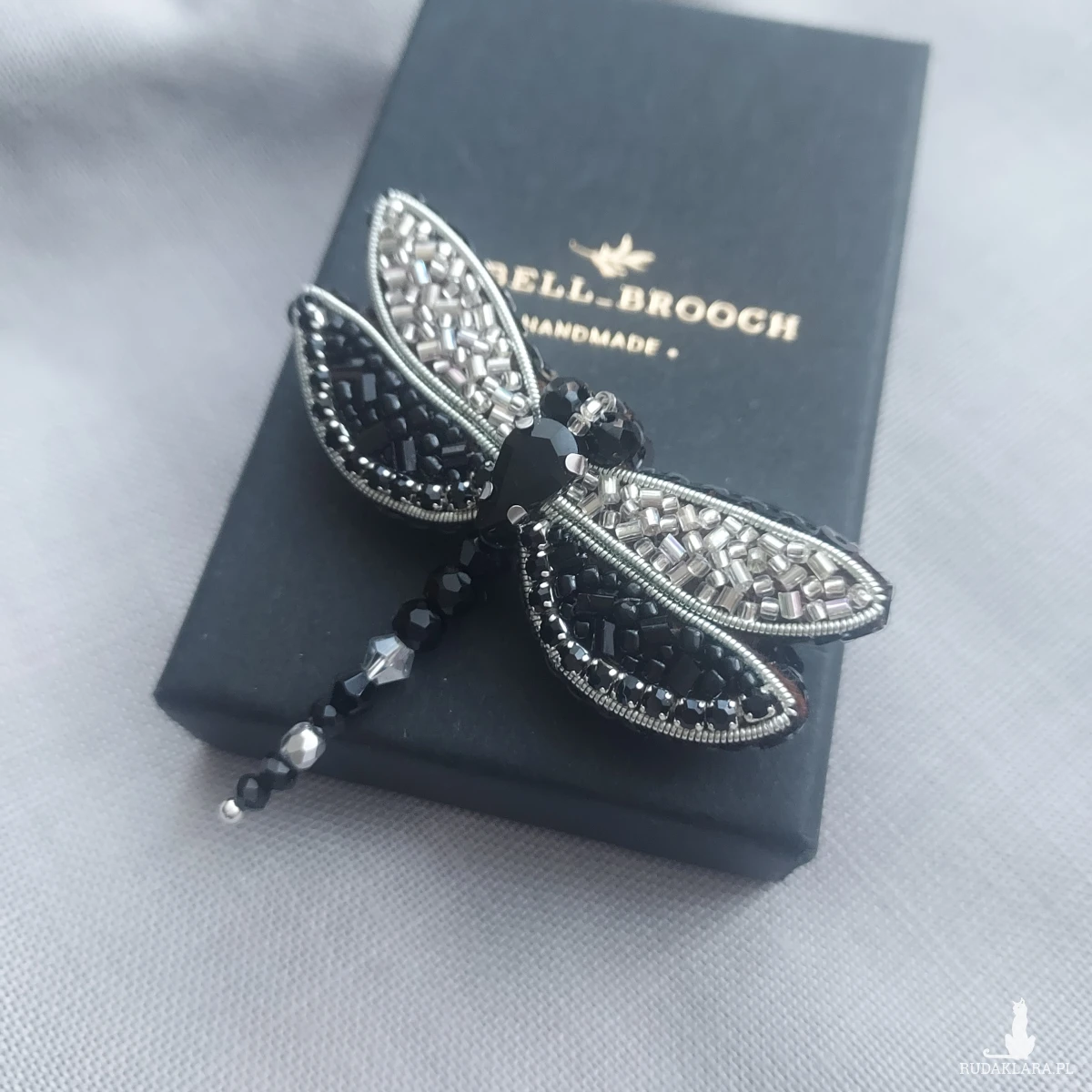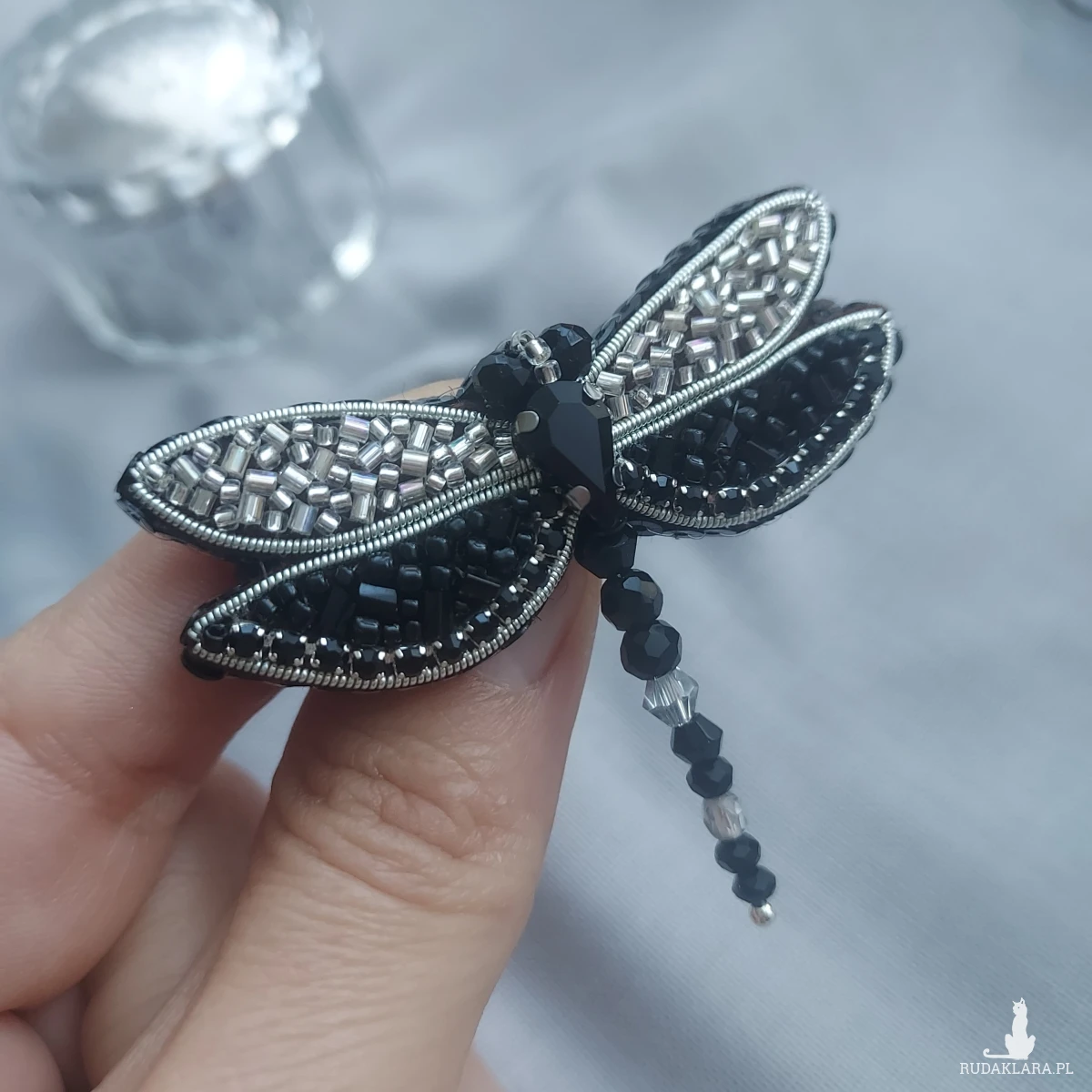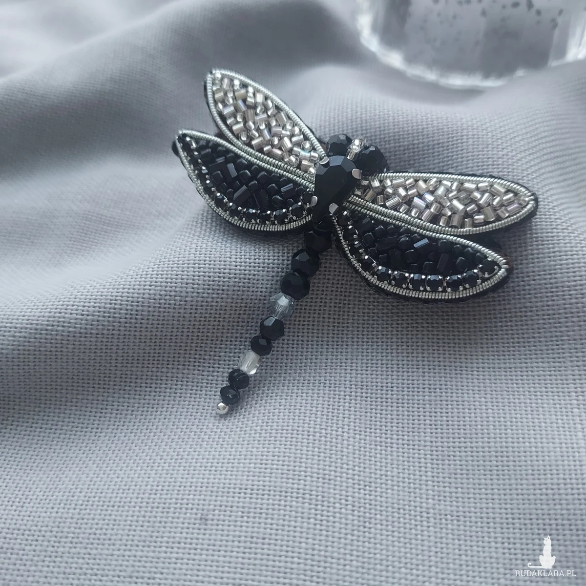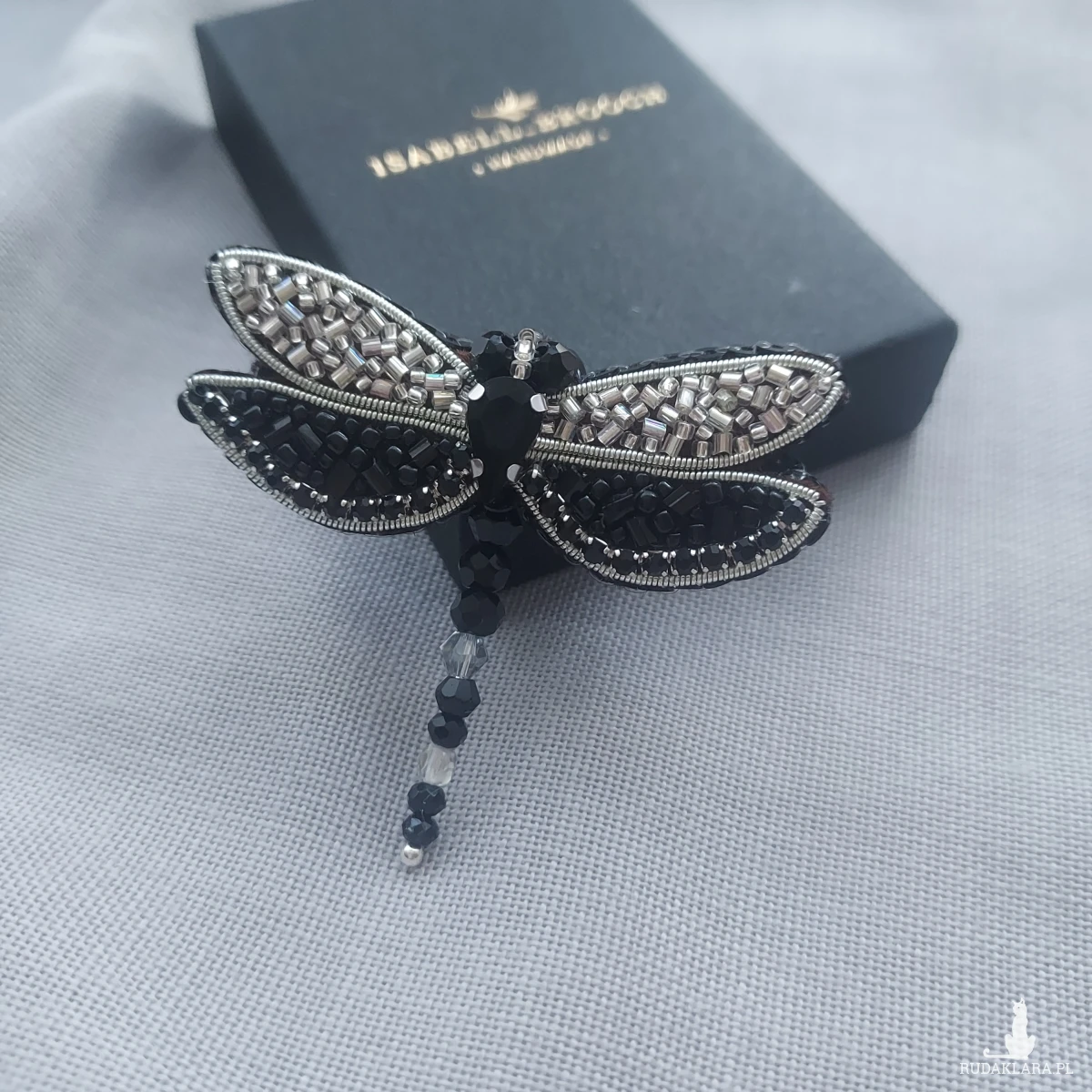 Broszka ważka w kolorze czarno-srebrnym - szaleństwo piękna i elegancji. Broszka wyszywana haftem koralikowym.