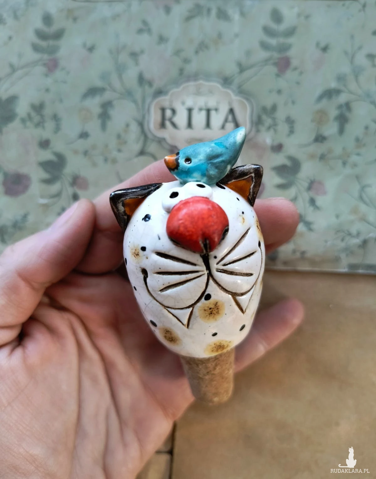 Korek do wina z nasadką z ceramiki w postaci kota. W stylu vintage. Wymiary ok 4,5 x 8,5 cm. Serdecznie polecam jako miły upominek dla bliskiej sercu osoby. Układ kolorów może nieznacznie się różnić od tego na zdjęciu.
