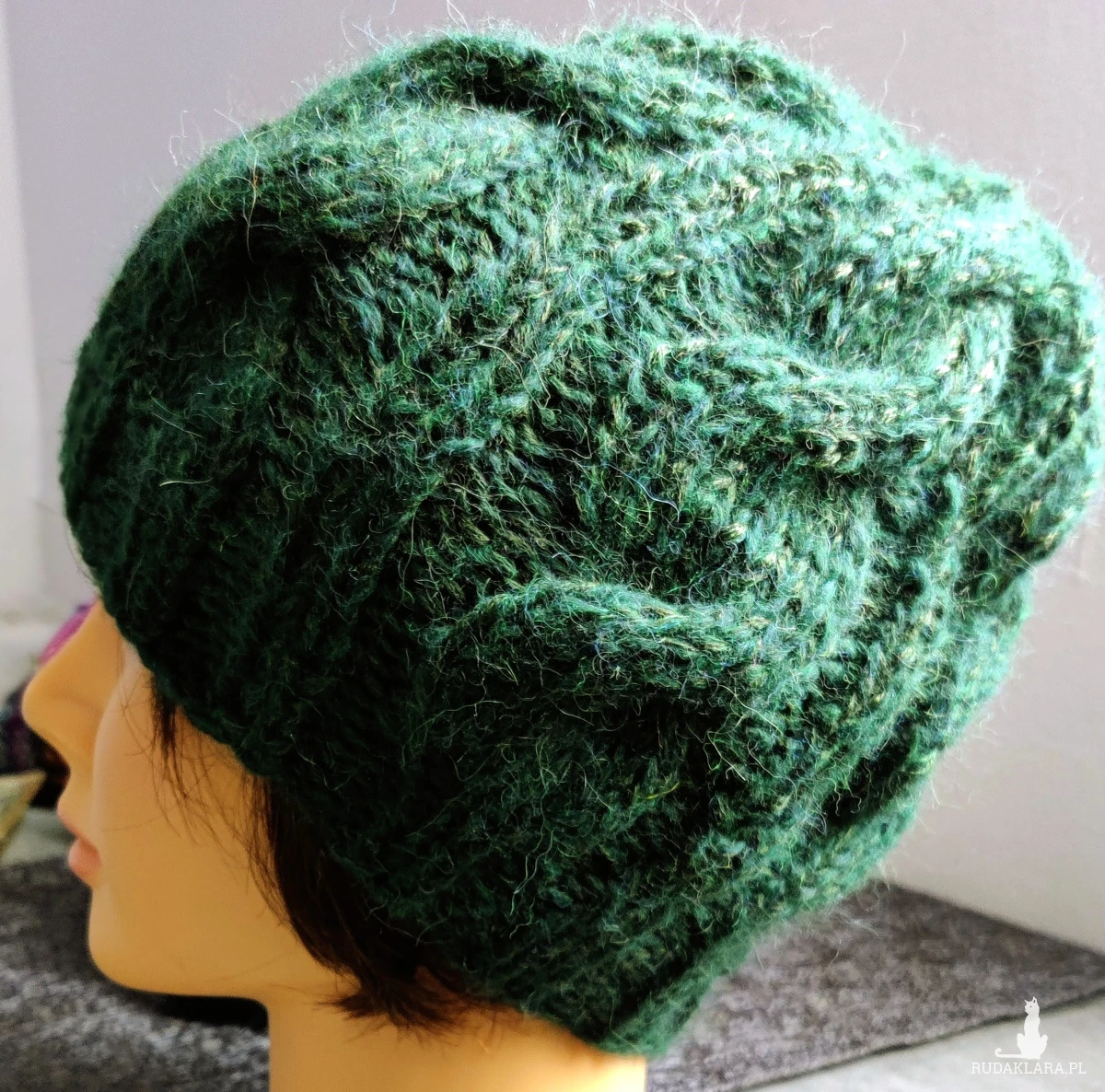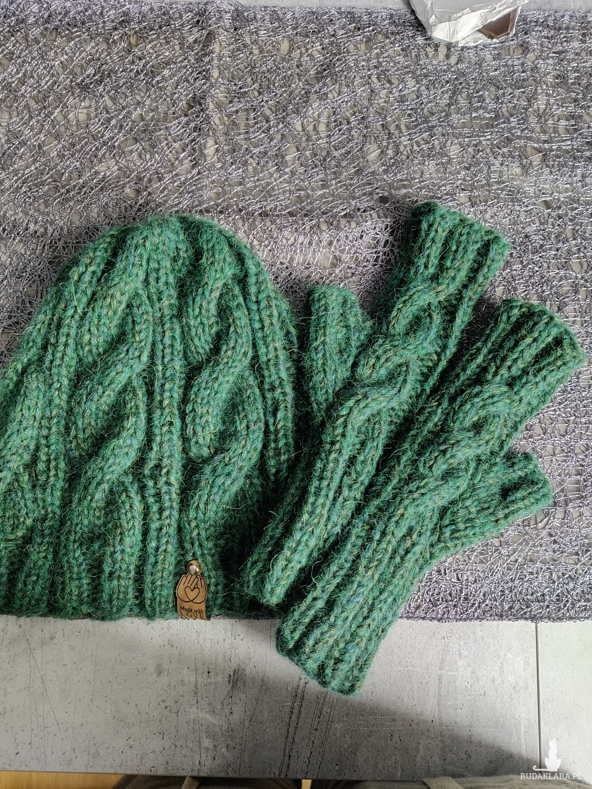 Czapka zimowa wełniana z rękawiczkami do kompletu ręcznie zrobione w kolorze zieleni butelkowej