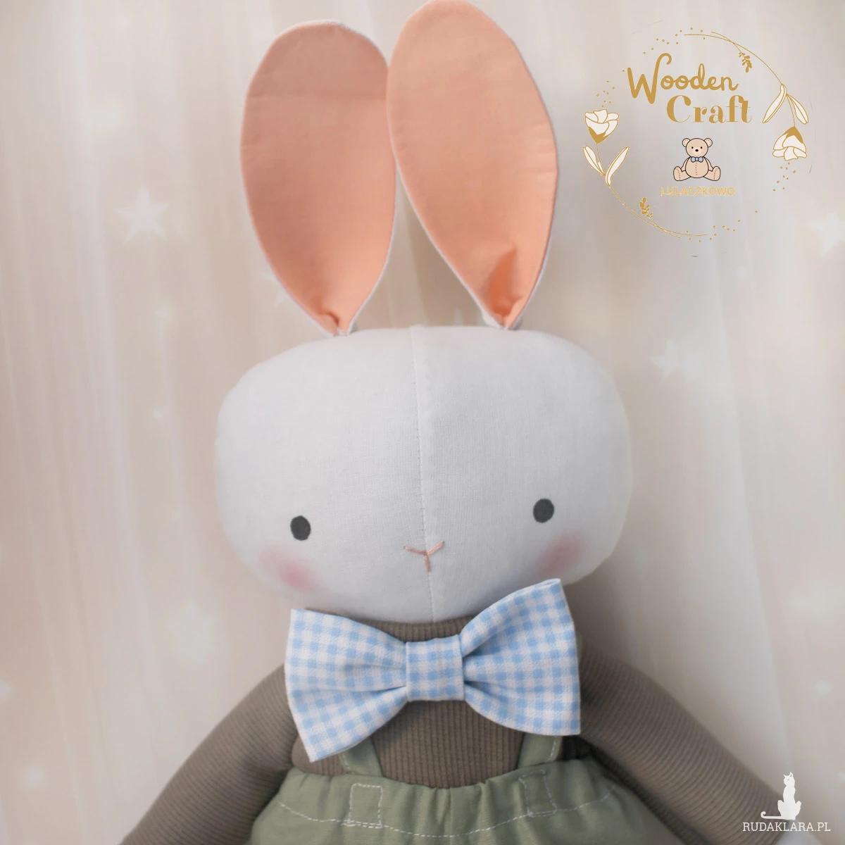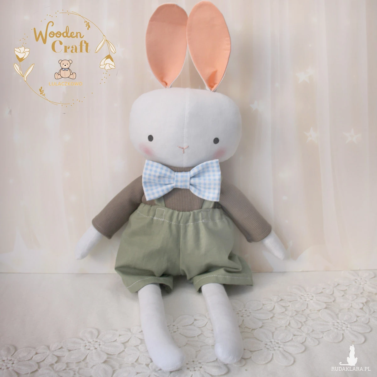 Przeurocza przytulanka, króliczek cały w bieli, uszyty ręcznie z najwyższą starannością, ubrany w brązowy sweterek, oliwkowozielone spodenki oraz błękitną muszkę w kratkę. Wykonany ze 100% bawełny, wypełniony antyalergiczną kulką silikonową. Oczka malowane wodoodpornym markerem, nosek wyszyty muliną. Spodenki, sweterek i kokardę można swobodnie zdejmować, posiadają gumeczki. Górne i dolne łapki układają się luźno, króliś siedzi z podparciem.