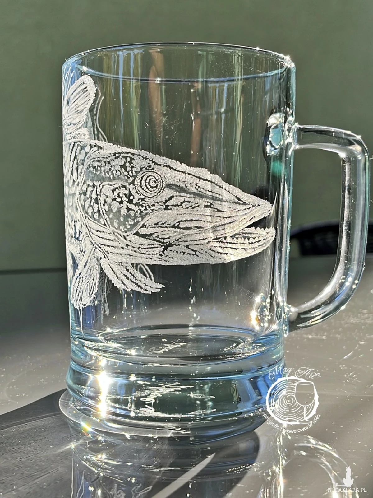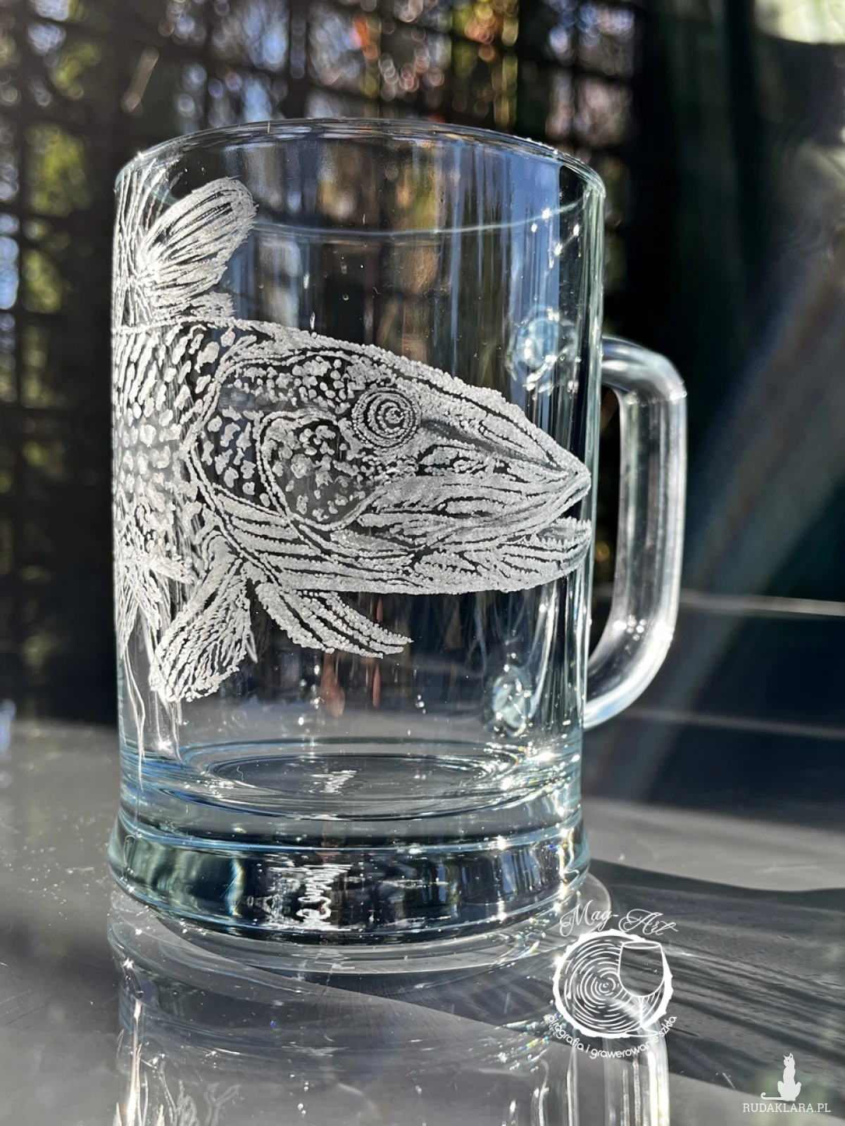 Egzemplarz został ręcznie grawerowany, dzięki czemu wzór szczupaka jest niepowtarzalny i pełen detali. Precyzyjny grawer wykonany na szkle pięknie odbija światło, nadając całości elegancki, rzemieślniczy charakter.