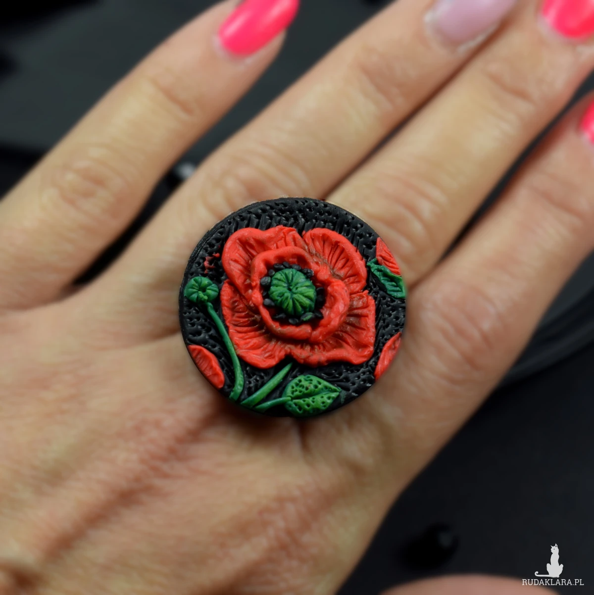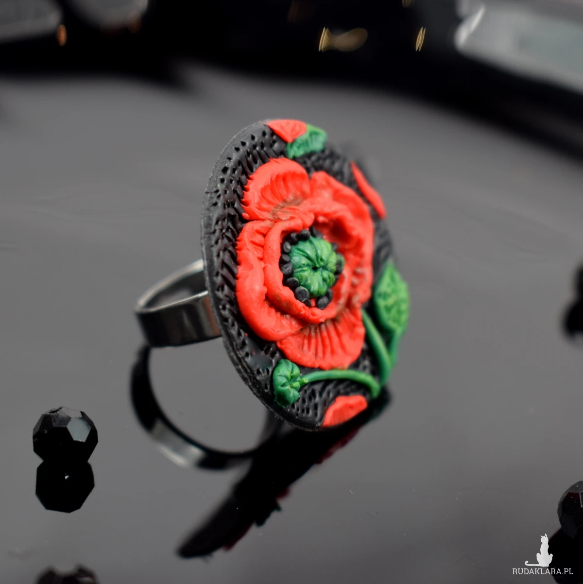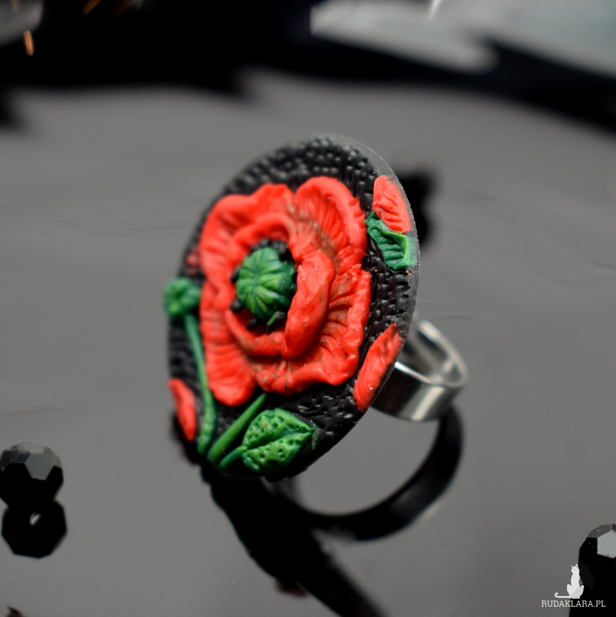 Duży, regulowany pierścionek z motywem kwiatu maku.