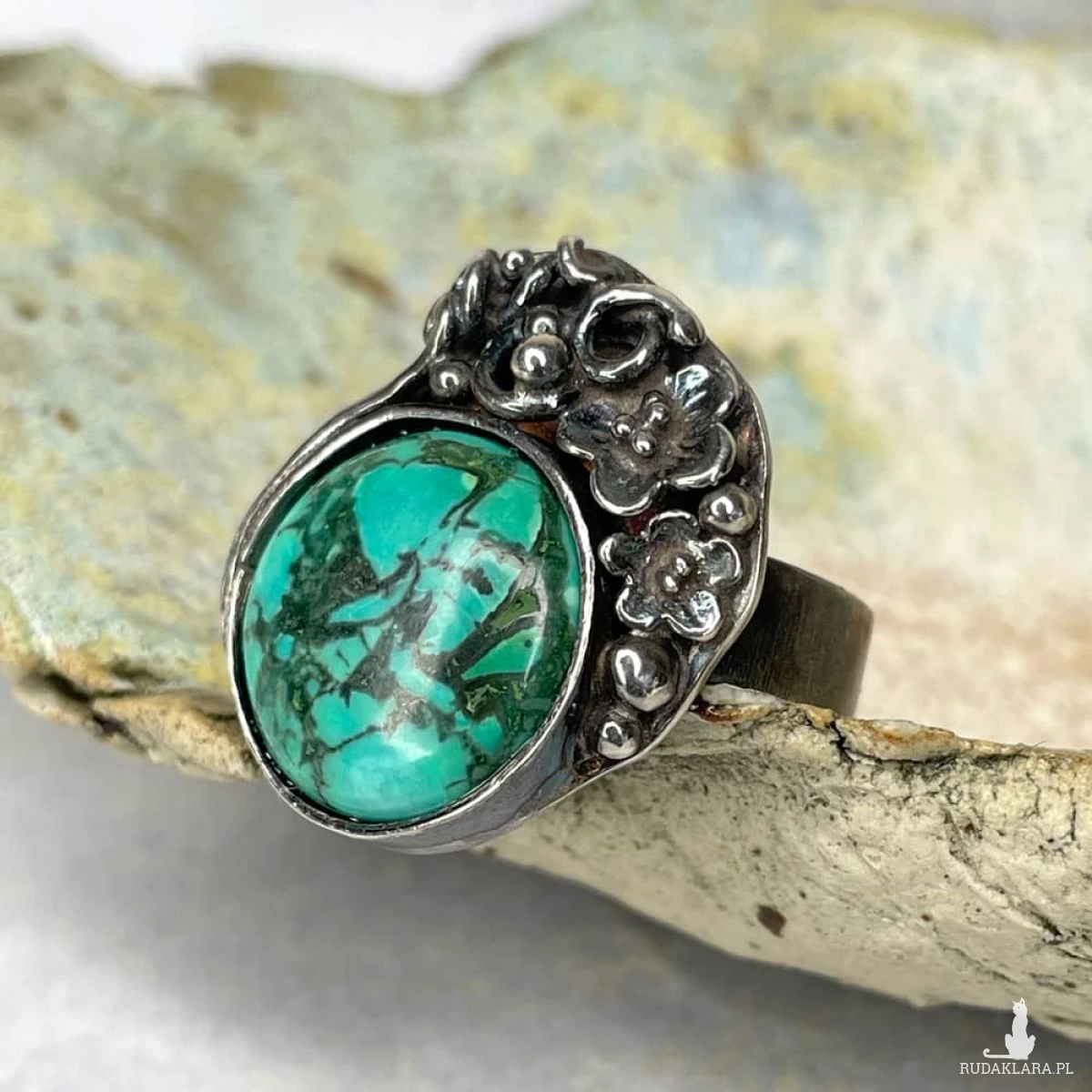 Wyjątkowy pierścień, w którym turkus afrykański o wyrazistym wzorze harmonijnie komponuje się ze srebrną oprawą, misternie zdobioną kwiatowymi motywami. Organiczne kształty i delikatne motywy kwiatowe nadają mu romantycznego charakteru, podkreślając naturalne piękno kamienia, czyniąc go efektownym dodatkiem na ważne okazje. Staranność wykonania i klasyczne wzornictwo czynią go doskonałym wyborem dla osób ceniących ponadczasową biżuterię.