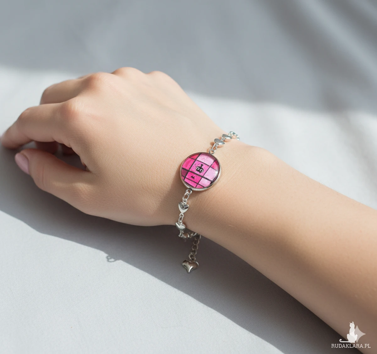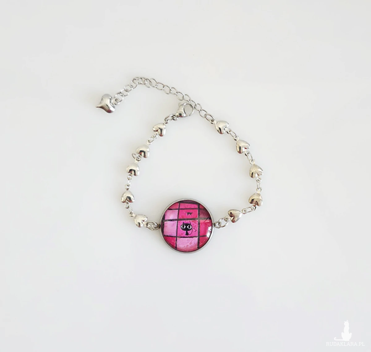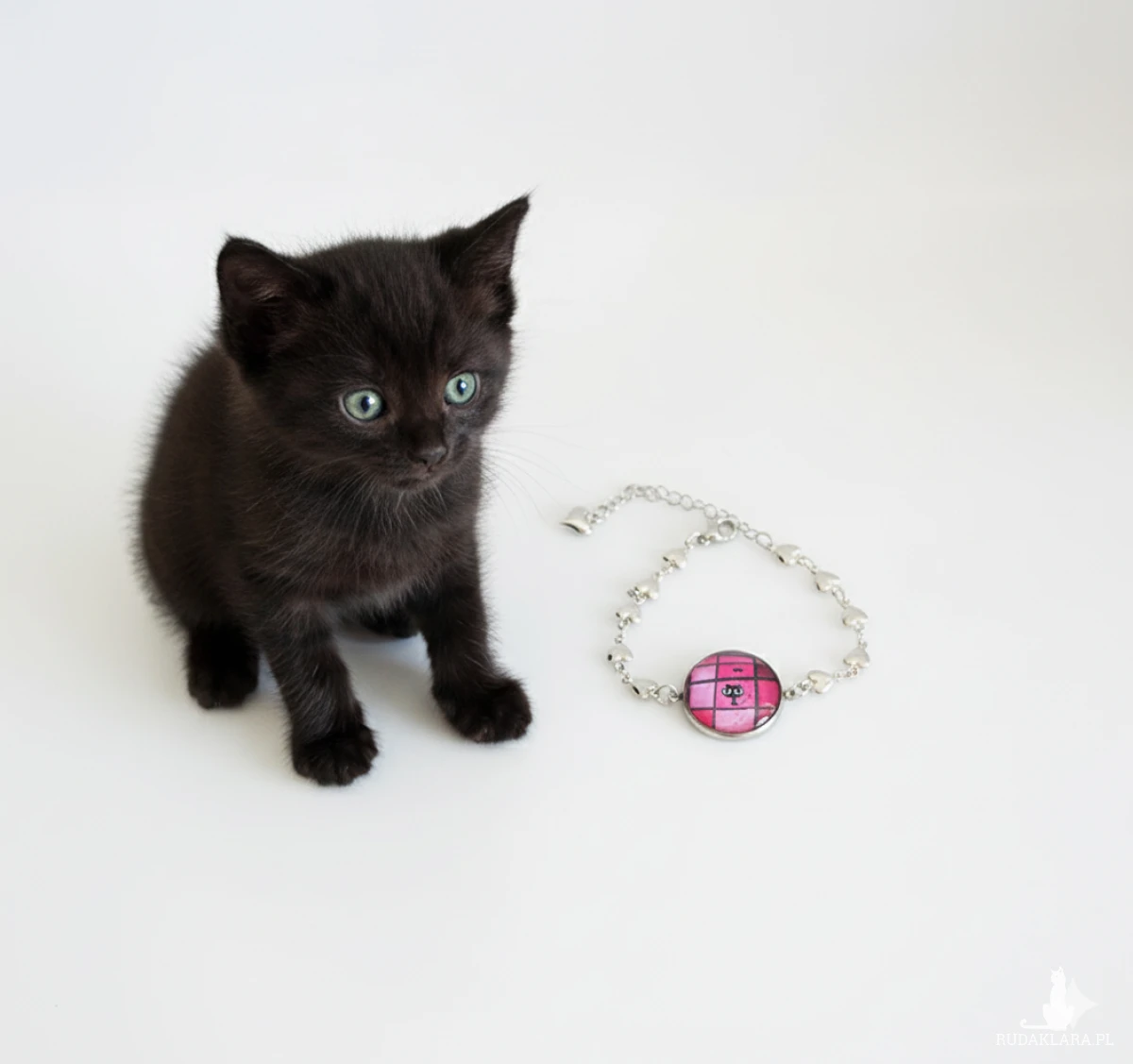 Z centralnym elementem przedstawiającym uroczego, czarnego kotka na różowym tle w kratkę, ta biżuteria doda charakteru każdej stylizacji.