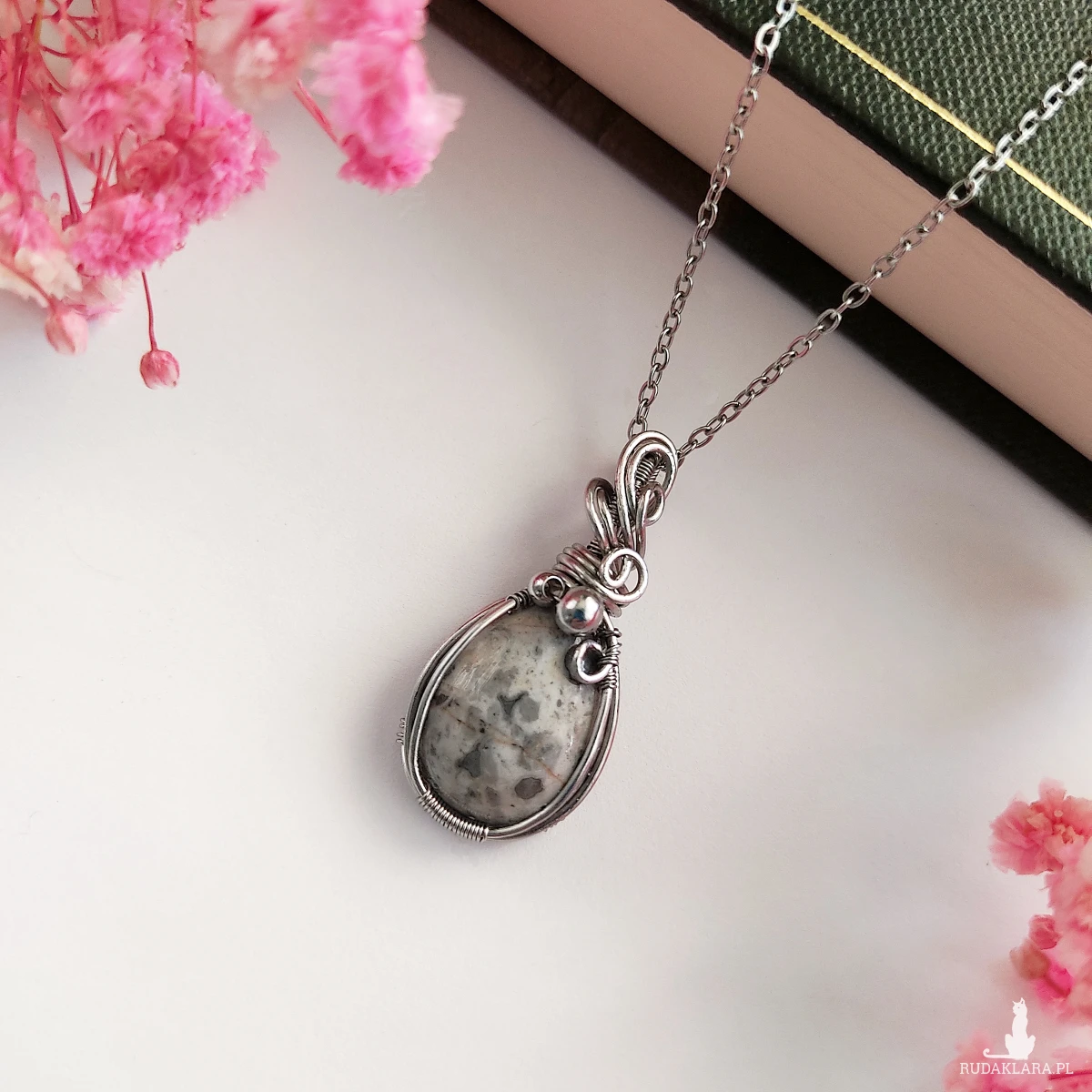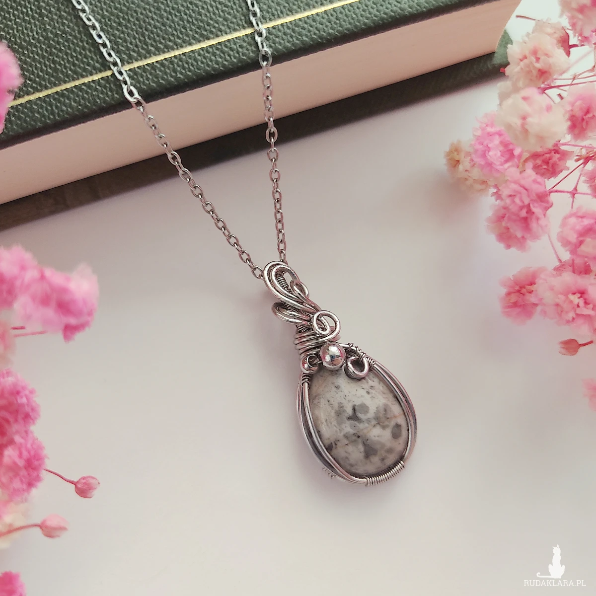 Naszyjnik Jaspis Szary ręcznie wykonany z drutów ze stali chirurgicznej metodą wire wrapping.