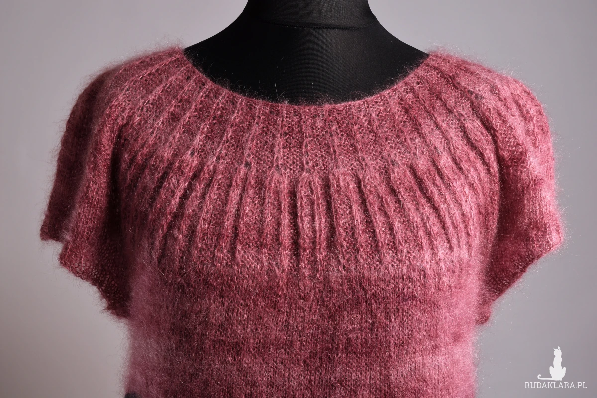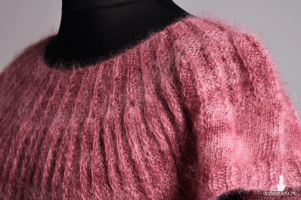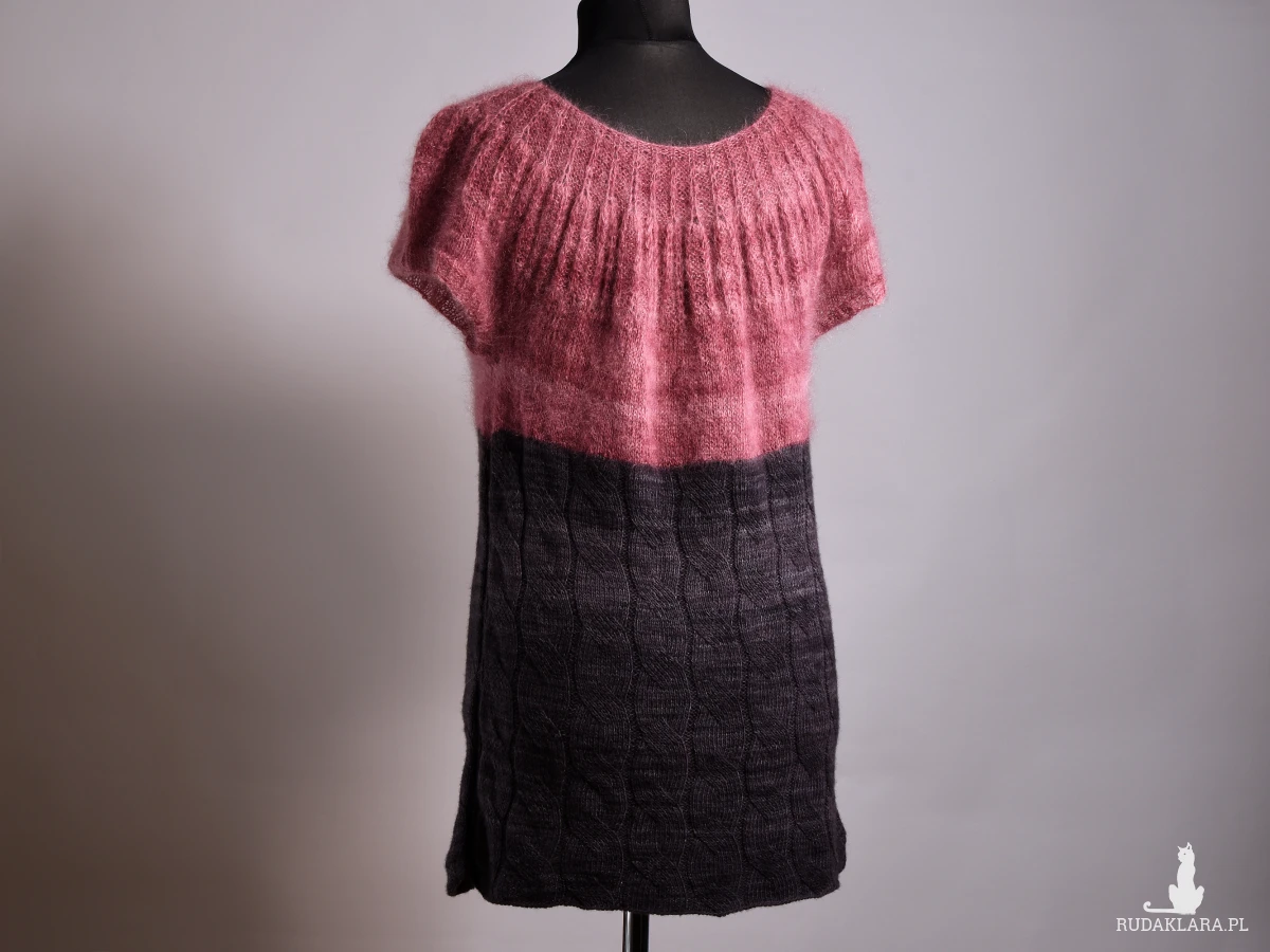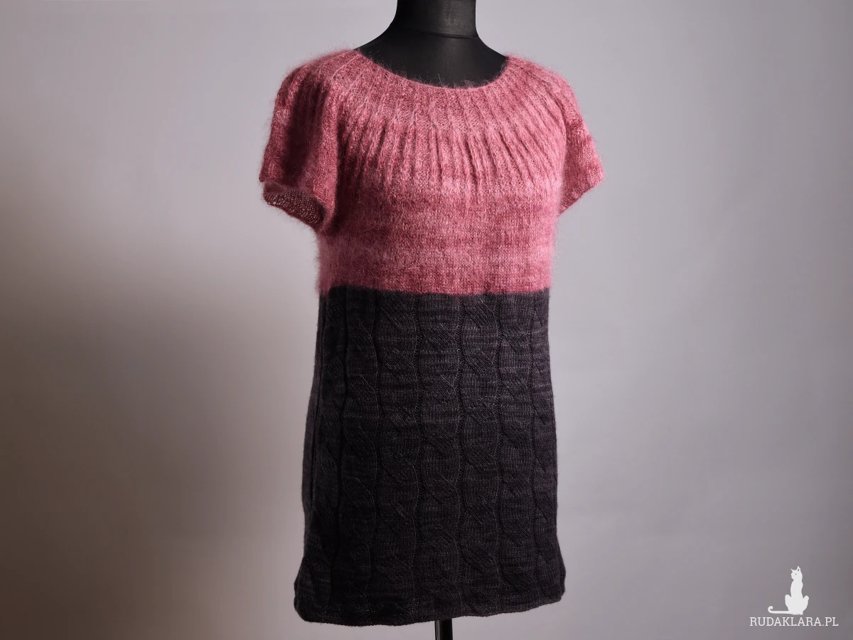 Damska tunika, podkreślająca walory kobiecej figury. Zrobiona ręcznie. Zrobiona na drutach. Tunika powstała ze śmiałego połączenia dwóch rodzajów włóczki: moheru w odcieniach różu i wełny z merynosów w odcieniach szarości. Okrągły dekolt podkreślony wzorem strukturalnym optycznie poszerza ramiona i powiększa biust. Szara część wykonana wzorem warkoczy, zaczynająca się tuż nad talią spływa wzdłuż sylwetki, optycznie ją wyszczuplając. Dzianina miękka i lekka, przyjemna w dotyku.
