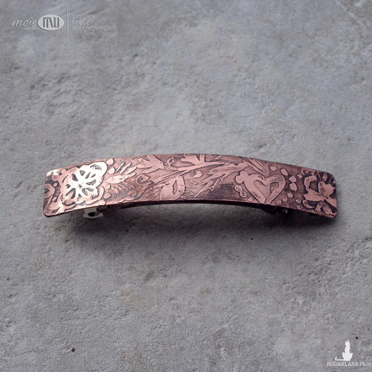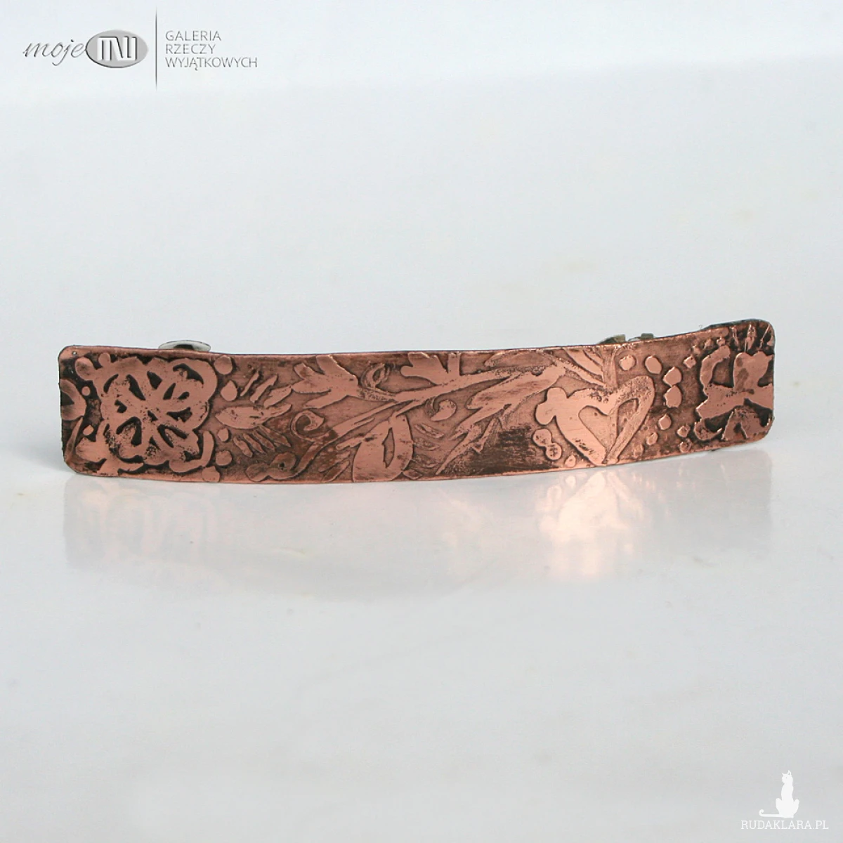W miedzianej blasze wytrawiłam florystyczne wzory, potem patynowałam i przetarłam dla wydobycia rysunku. Klamra to standardowy metalowy mechanizm.