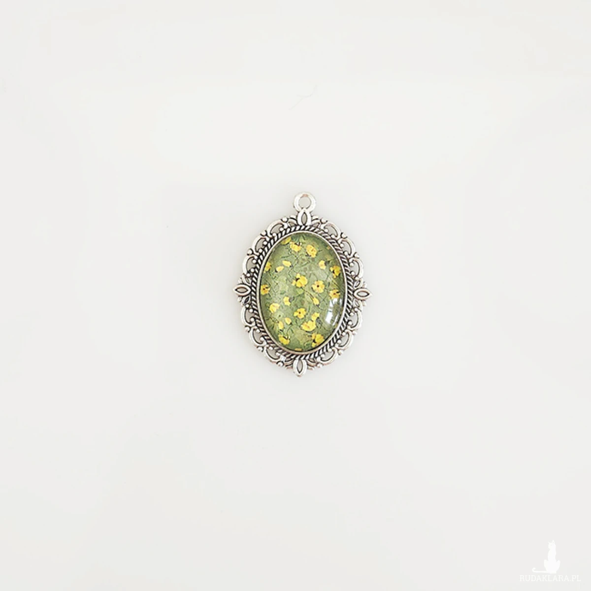 Ten owalny medalion z delikatnym, zielonym tłem i rozsypanymi drobnymi, żółtymi kwiatkami to prawdziwa miniatura natury. Oprawiony w ozdobną ramkę, inspirowaną stylem vintage, doskonale oddaje sielankowy klimat letniego popołudnia.