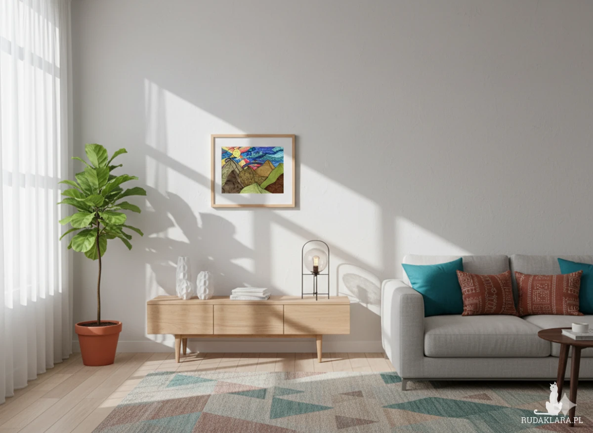 Góry na pierwszym planie są stabilne, ale każda z nich ma inną, precyzyjną, geometryczną fakturę (linie, siatki, kropki), co symbolizuje zmienność i złożoność świata, nawet w jego najbardziej ugruntowanych elementach.