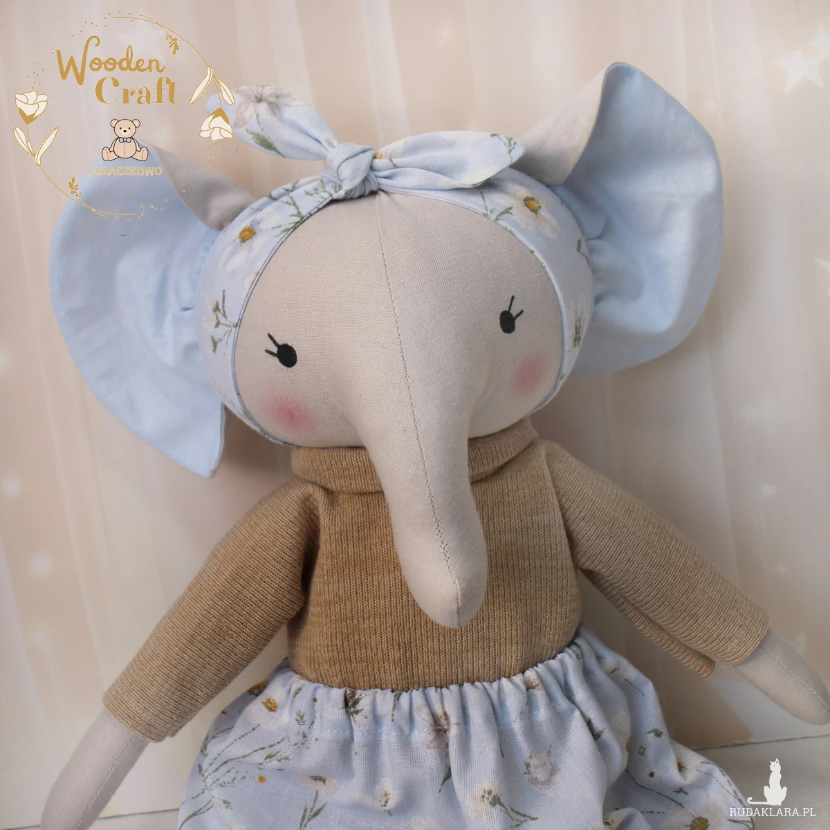 Przeurocza przytulanka słonik, a właściwie słoniczka w kolorze szarym, uszyta ręcznie z najwyższą starannością, ubrana w uroczy beżowy sweterek oraz błękitną spódniczkę z motywem stokrotek, z błękitną opaską na głowie. Wykonana ze 100% bawełny, wypełniona antyalergiczną kulką silikonową. Oczka malowane wodoodpornym markerem. Górne i dolne łapki układają się luźno, słoniczka siedzi z podparciem. Zarówno sweterek jak i spódniczkę można swobodnie zdejmować, w pasie jest wciągnięta gumeczka.