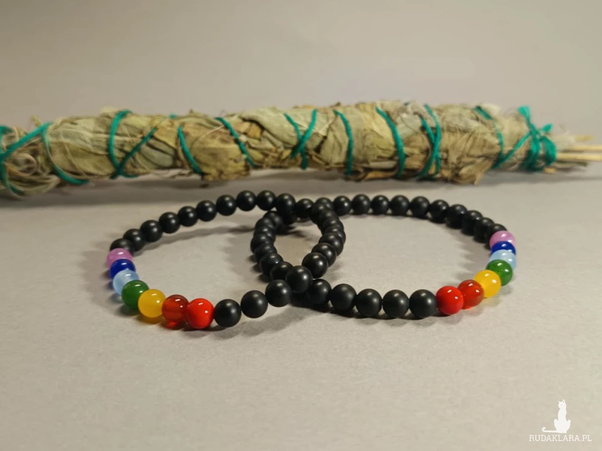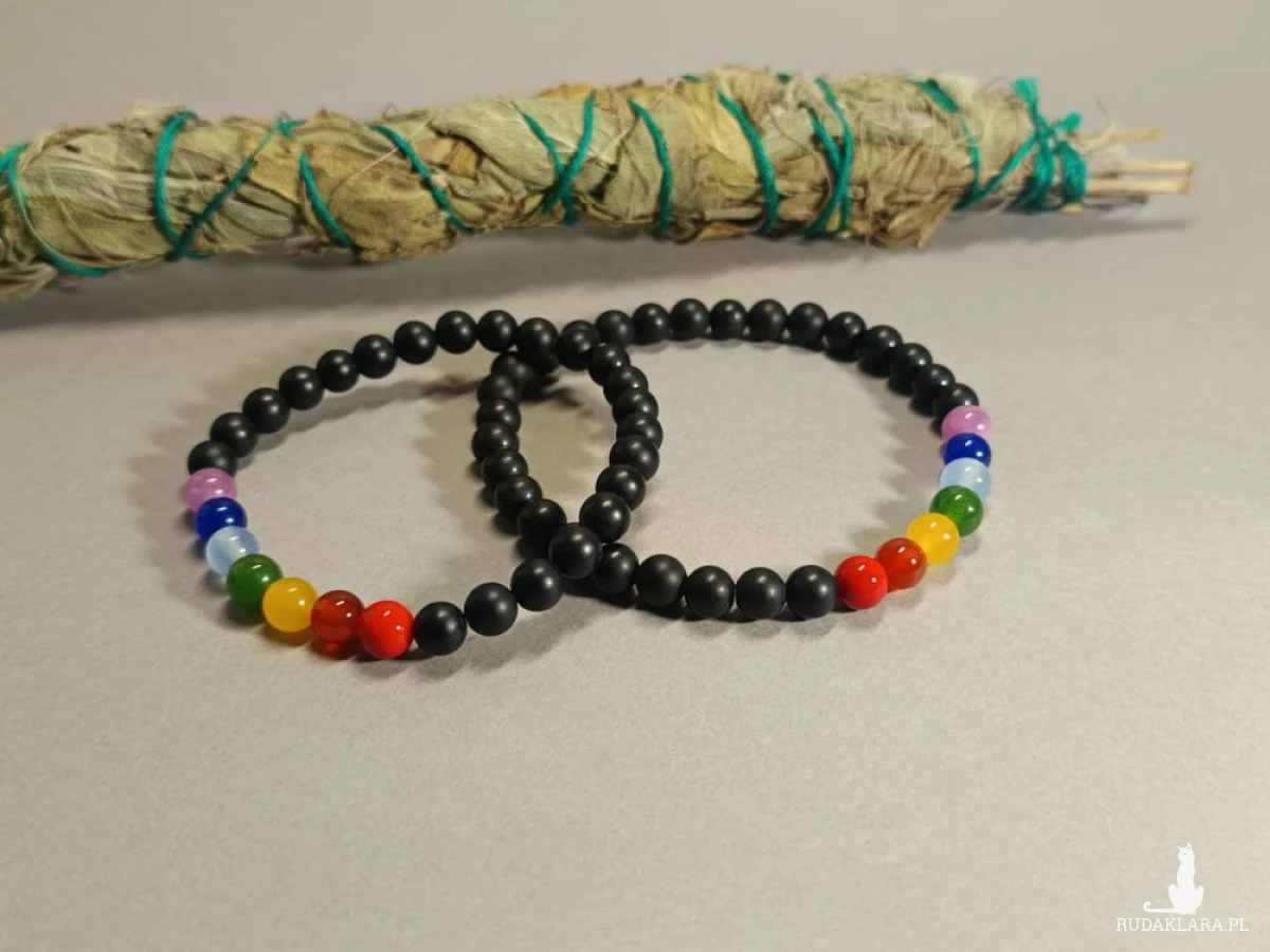 Bransoletki wspierające czakry. Dedykowane na nadgarstek 15/16 cm oraz 18/19 cm ( jest możliwość wykonania ich w innym rozmiarze po uprzednim kontakcie ze mną). Elegancja, równowaga i umocnienie energii życiowej. Kamienie w bransoletkach to czarny onyks i wielobarwne jaspisy, rezonujące z kolorami czakr.