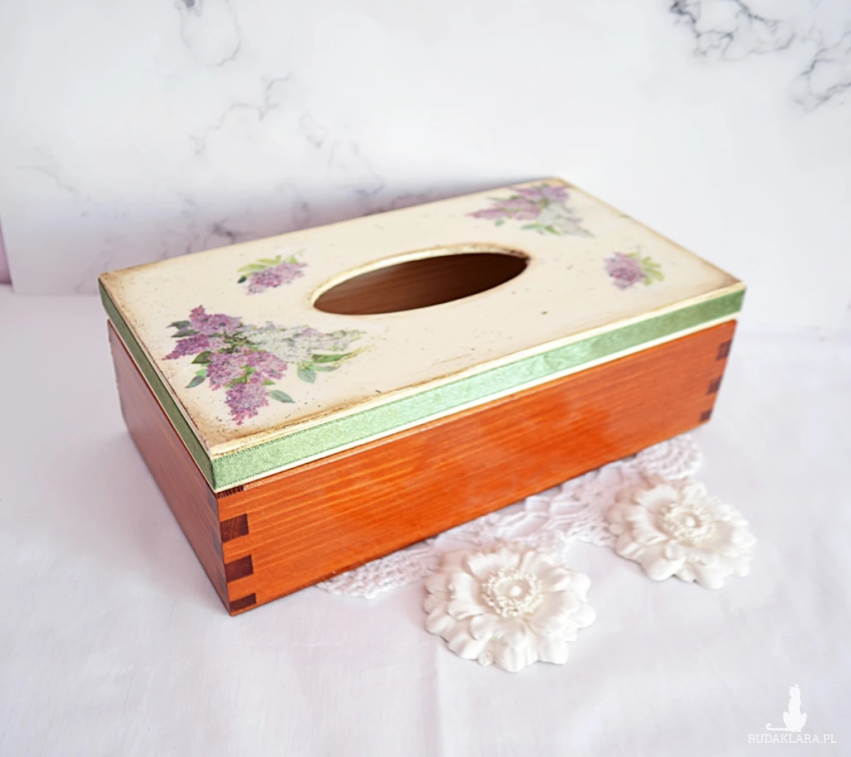 Oryginalny drewniany chustecznik w kolorach brązu i zieleni zdobiony metodą decoupage. Chustecznik jest zabezpieczony lakierem bezbarwnym