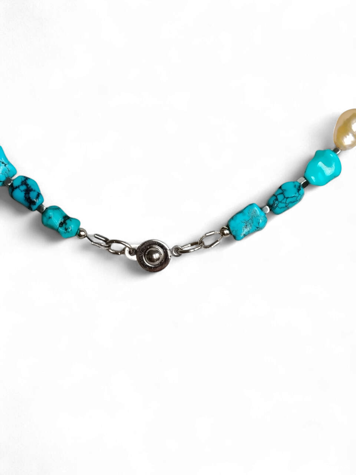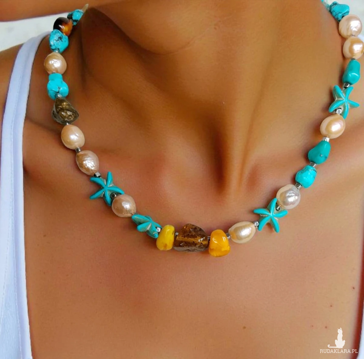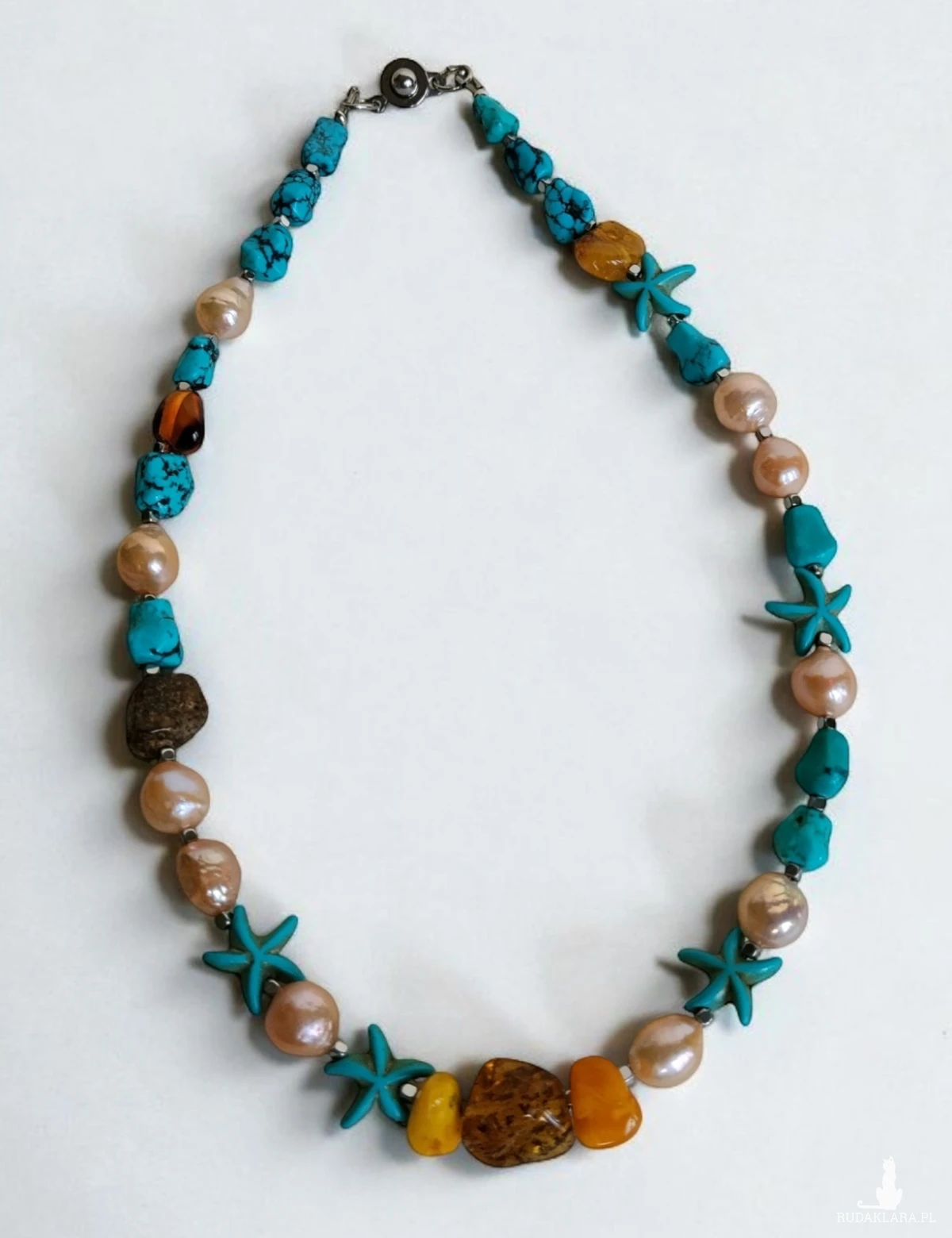 Ten naszyjnik będzie w krótkie zimowe dni przypominać o lecie i morzu, zrobiony bowiem został z darów morza - pereł barokowych, bursztynów i turkusowych howlitów, które co prawda nie należą do owoców morza, ale przypominają je kolorem. Wielkość elementów naszyjnika wynosi ok.10 mm, wykończenie to stal szlachetna, długość naszyjnika 45 cm.
