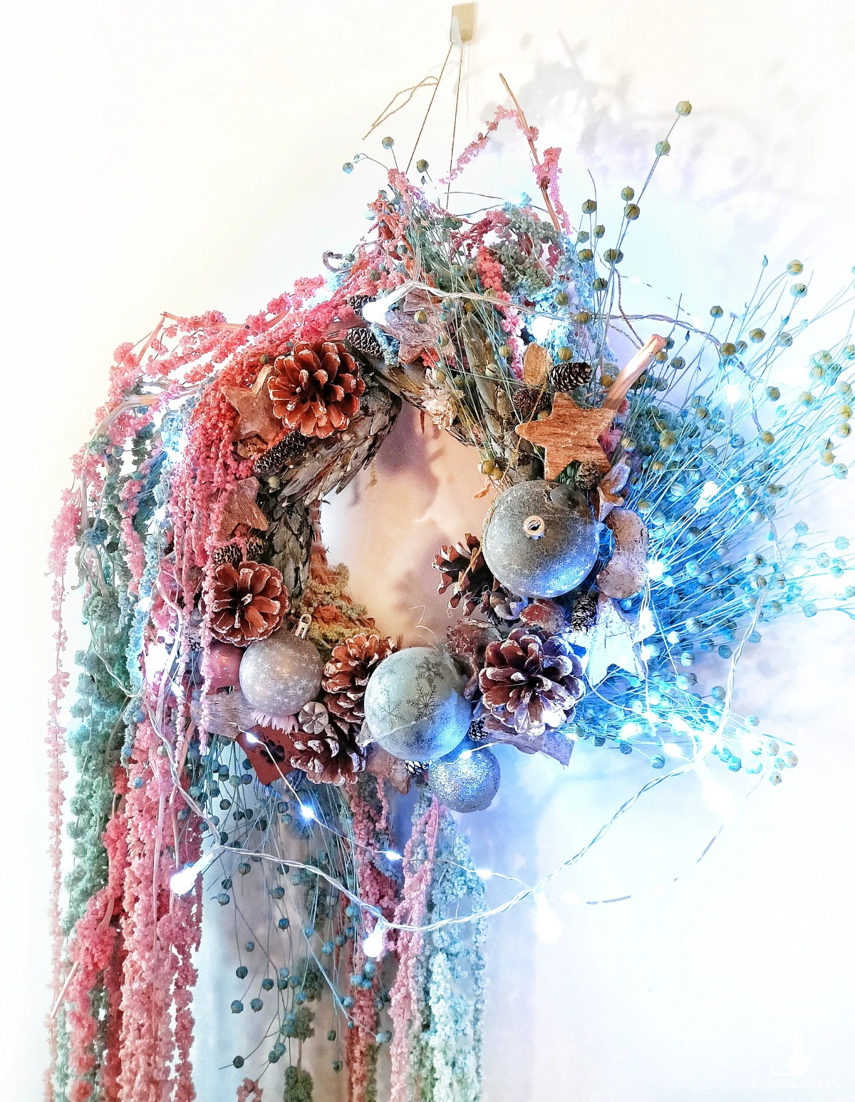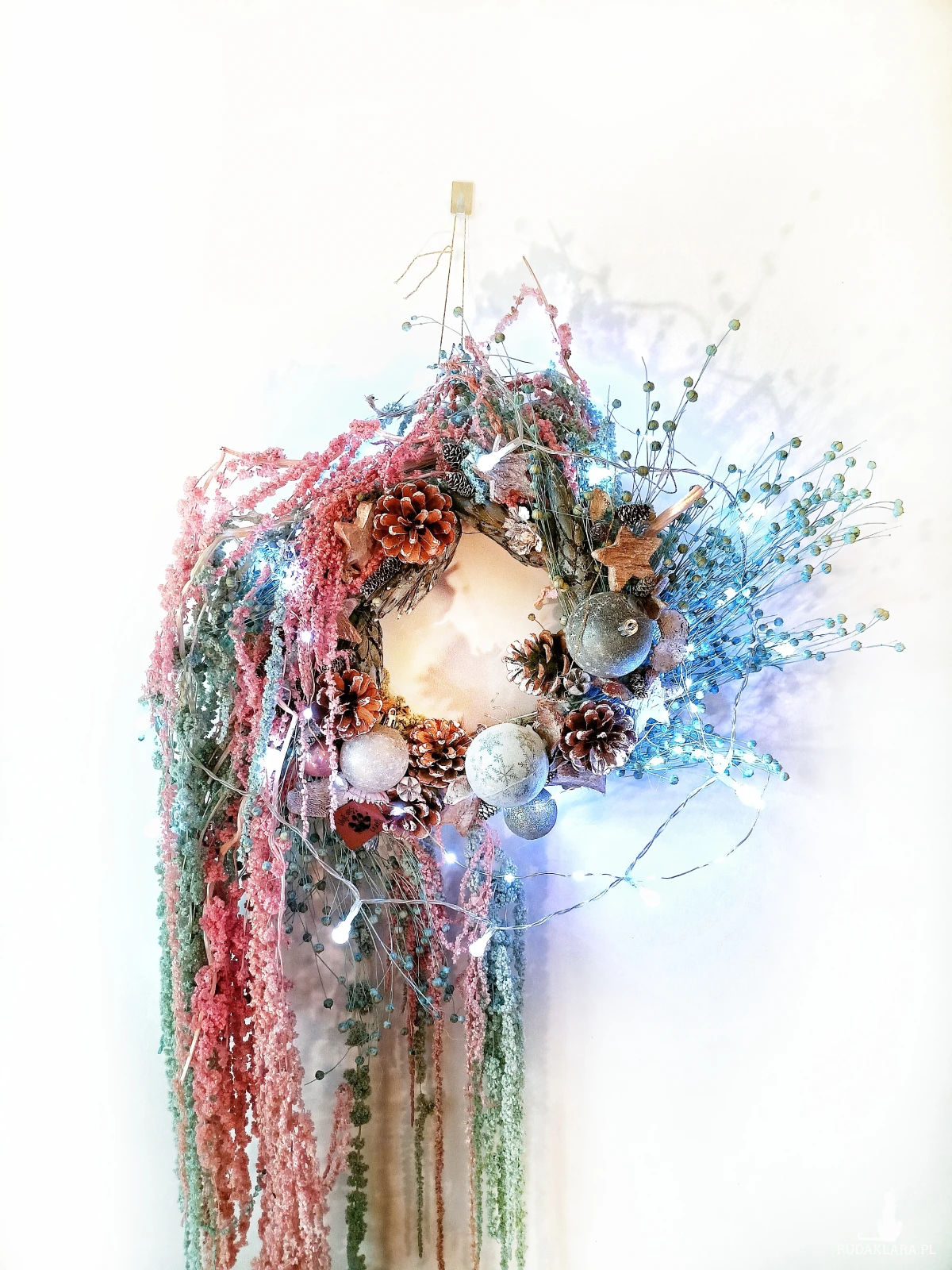 wianek zimowy handmade • wianek bożonarodzeniowy • dekoracja świąteczna LED • wianek pastelowy błękitny różowy • wianek dla lodowej księżniczki • wianek z suszonych kwiatów • stroik zimowy z lampkami • dekoracja glamour • wianek na drzwi zimowy • zimowa ozdoba handmade