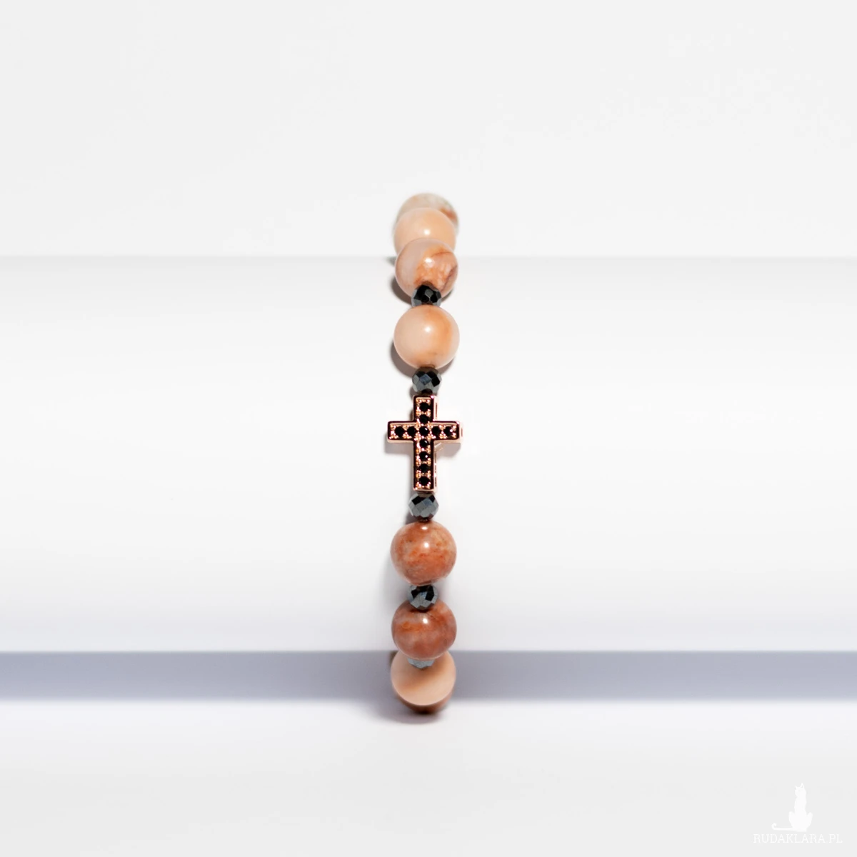 Unikatowa damska bransoletka różaniec z jadeitem brzoskwiniowym i hematytem to połączenie subtelności z energią ochrony. Ciepły odcień jadeitu symbolizuje spokój, kobiecą energię i wewnętrzne światło, natomiast chłodny połysk hematytu dodaje pewności siebie i równowagi. Całość dopełnia krzyżyk z cyrkoniami ze stali szlachetnej, który lśni przy każdym ruchu nadgarstka, przyciągając wzrok i emanując elegancją.