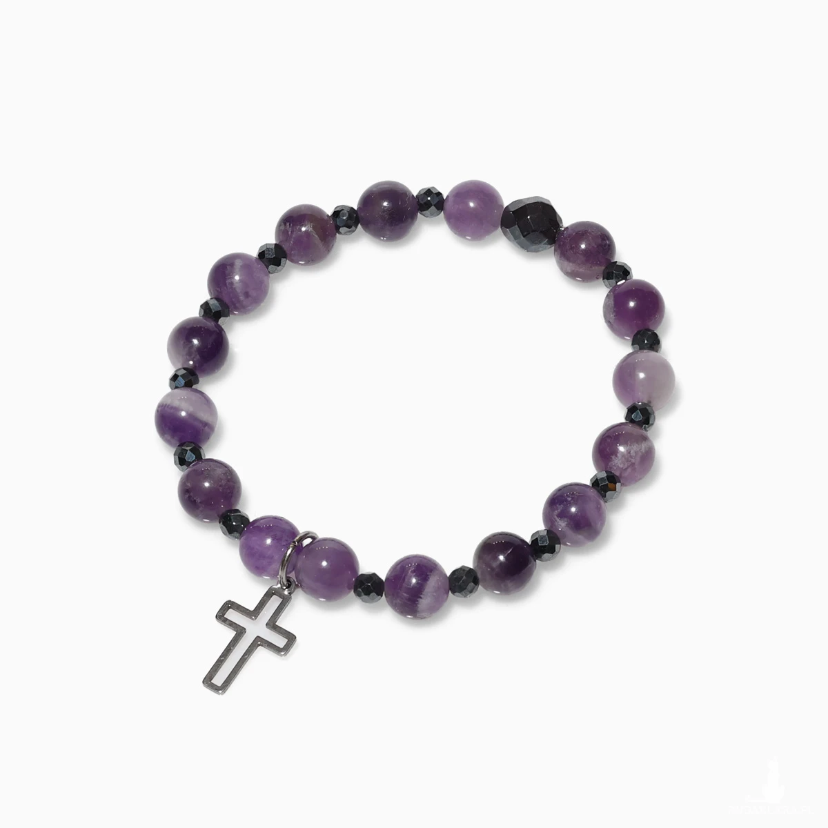 Bransoletka została ręcznie wykonana z naturalnych kamieni, co czyni ją wyjątkową pod względem energii i estetyki. Delikatne odcienie fioletu ametystu współgrają z chłodnym, metalicznym blaskiem hematytu, tworząc harmonijną i elegancką kompozycję.