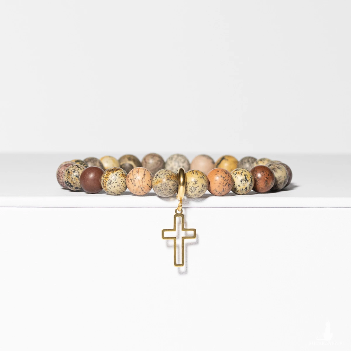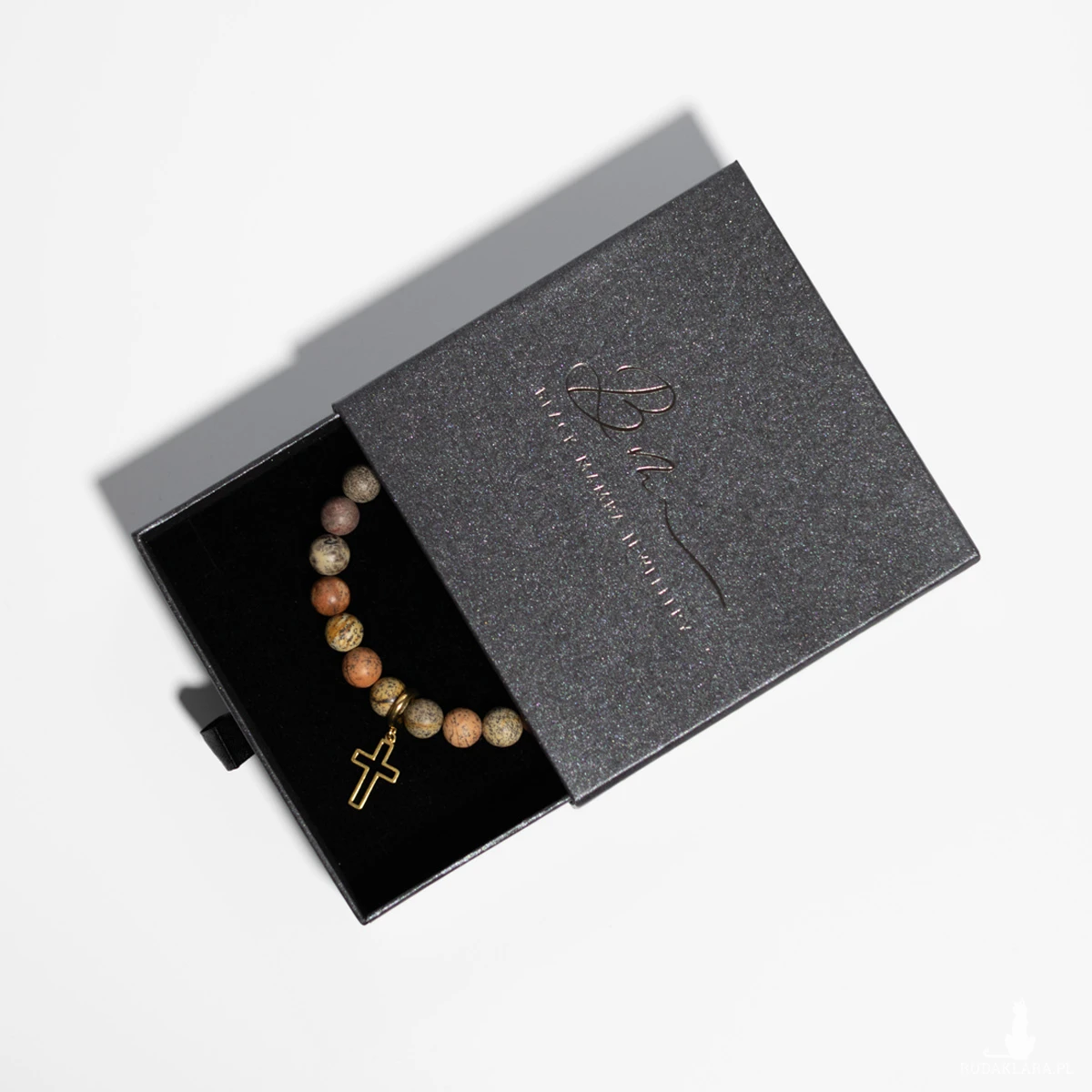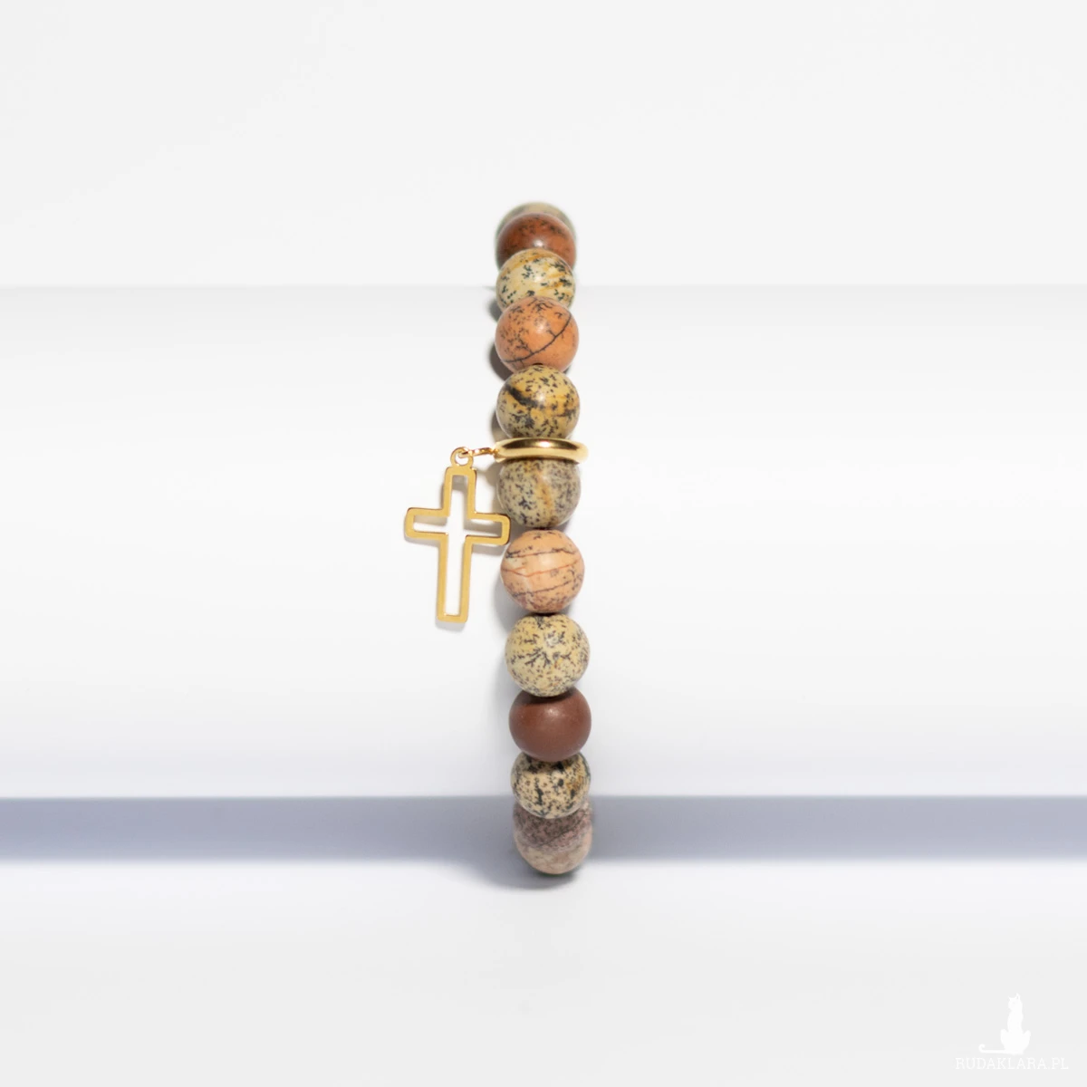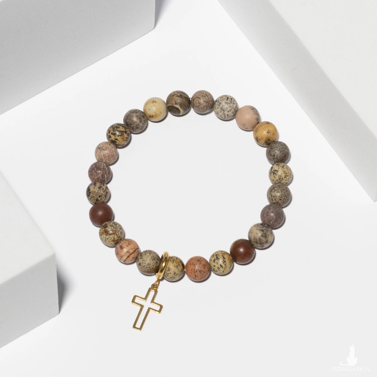 Ciepłe beże, głębokie brązy i czarne żyłki tworzą kompozycję, której nie da się zreplikować. Każdy kamień nosi ślady czasu i natury – żaden nie jest identyczny z drugim. Krzyżyk ze stali szlachetnej dodaje dyskretnego, ale trwałego akcentu – symbol nadziei, siły ducha i własnej drogi.
