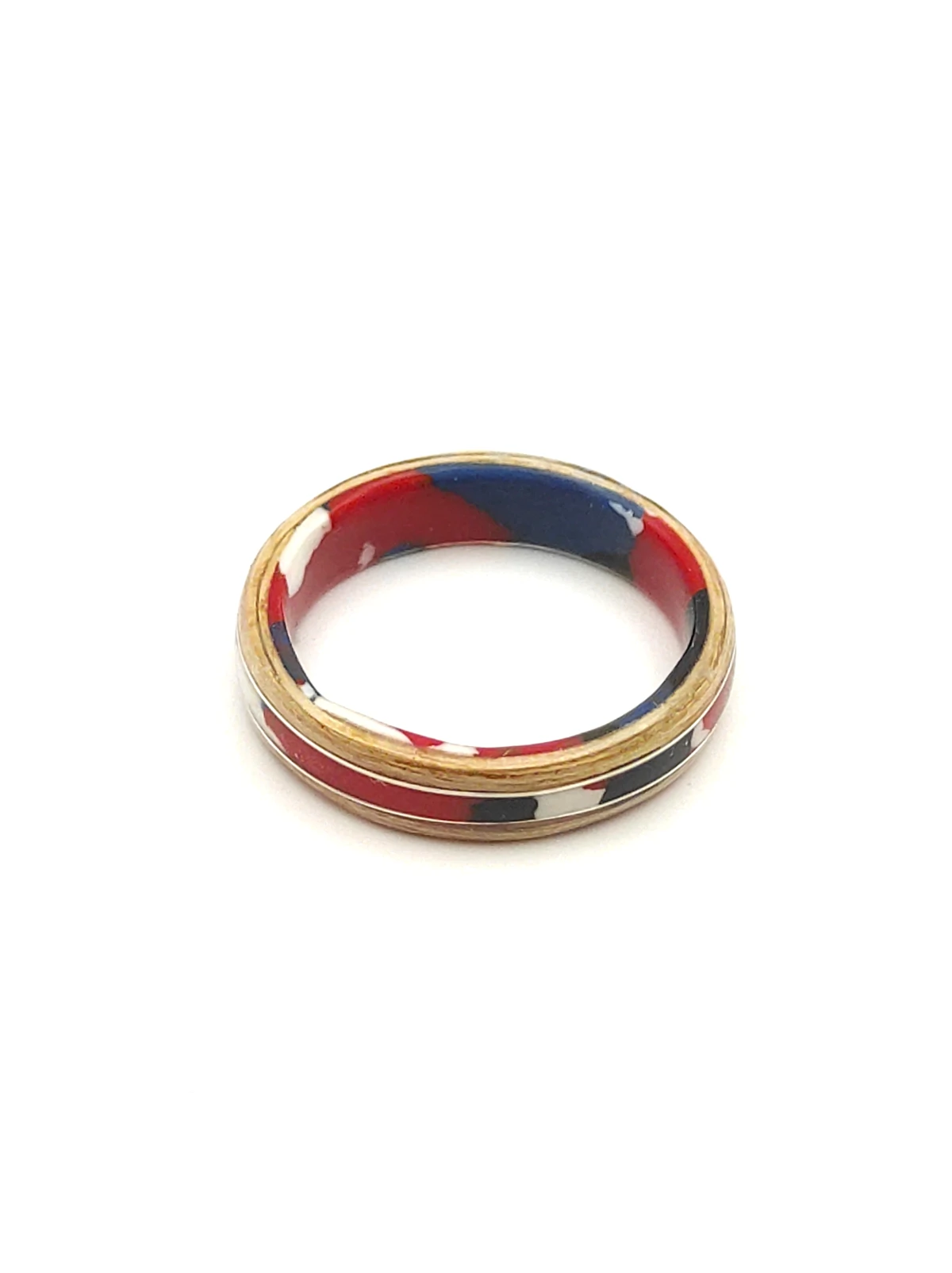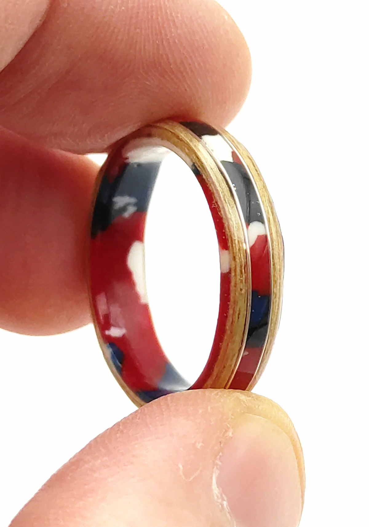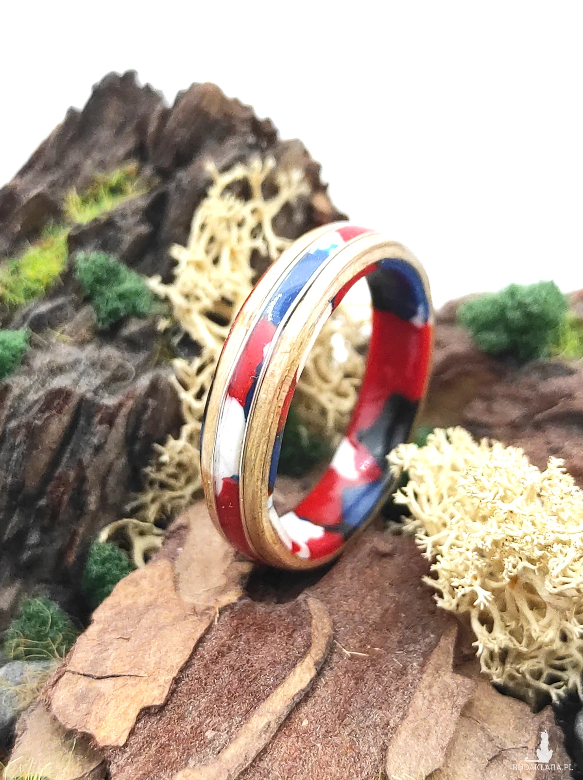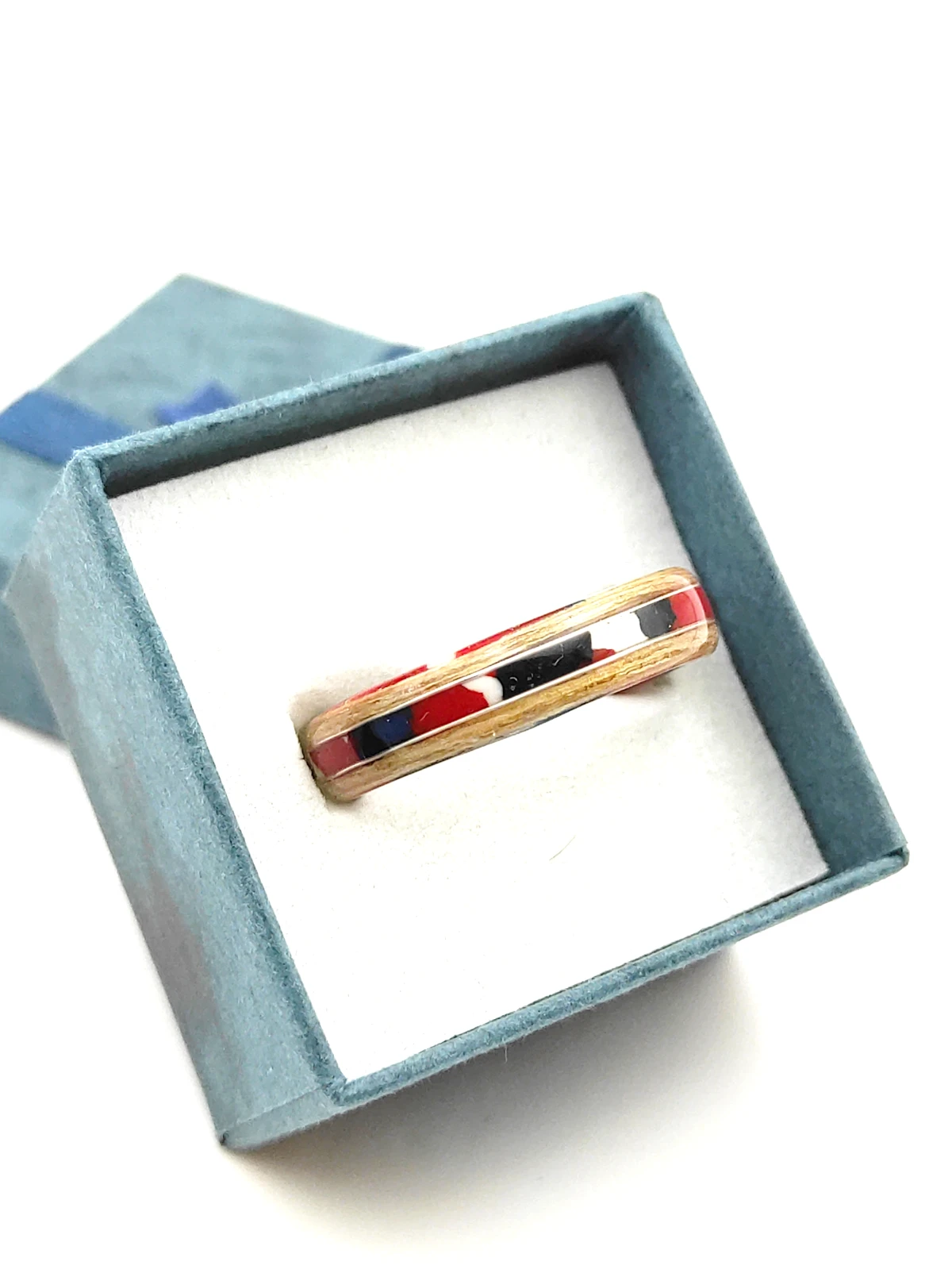 Każdy pierścionek powstaje ręcznie w pracowni Woodrings by Jet. Drewno bukowe zostało starannie dopasowane, a kolorowy celuloid precyzyjnie wkomponowany, tworząc wyjątkowy wzór widoczny zarówno na zewnątrz, jak i wewnątrz pierścionka. Całość zabezpieczona jest specjalną powłoką ochronną, która nadaje gładkość, połysk i odporność na wilgoć.