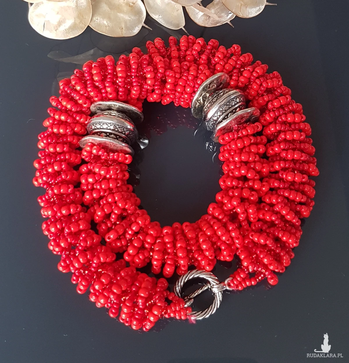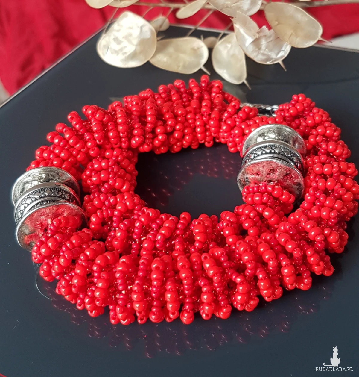 Naszyjnik w intensywnym czerwonym kolorze, wypleciony z małych