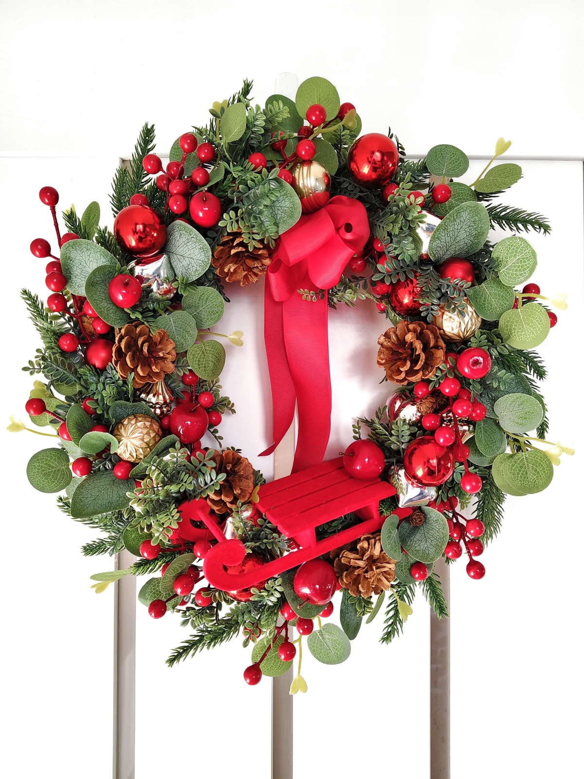 Świąteczny sztuczny wianek został wykonany z gałązek wysokiej jakości. W roli głównej urocze czerwone sanki) Ozdobiony szyszkami, owocami glogu, jabłuszkami i bombkami w odcieniach czerwieni, srebra i złota.