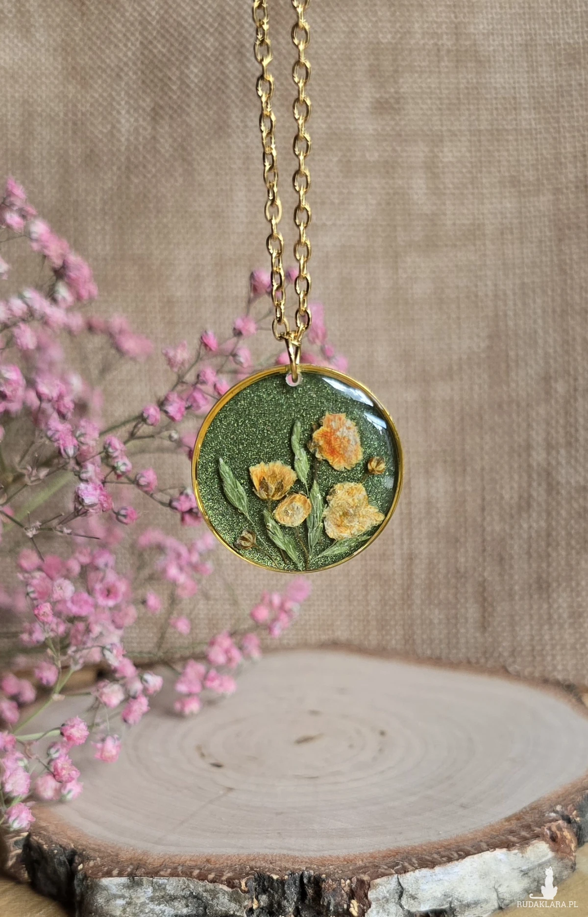 Oferuję Państwu unikalną biżuterię. Zawieszka jest wykonana z suszonych kwiatów i żywicy epoksydowej. Biżuteria jest wspaniałym i oryginalnym prezentem na lata.