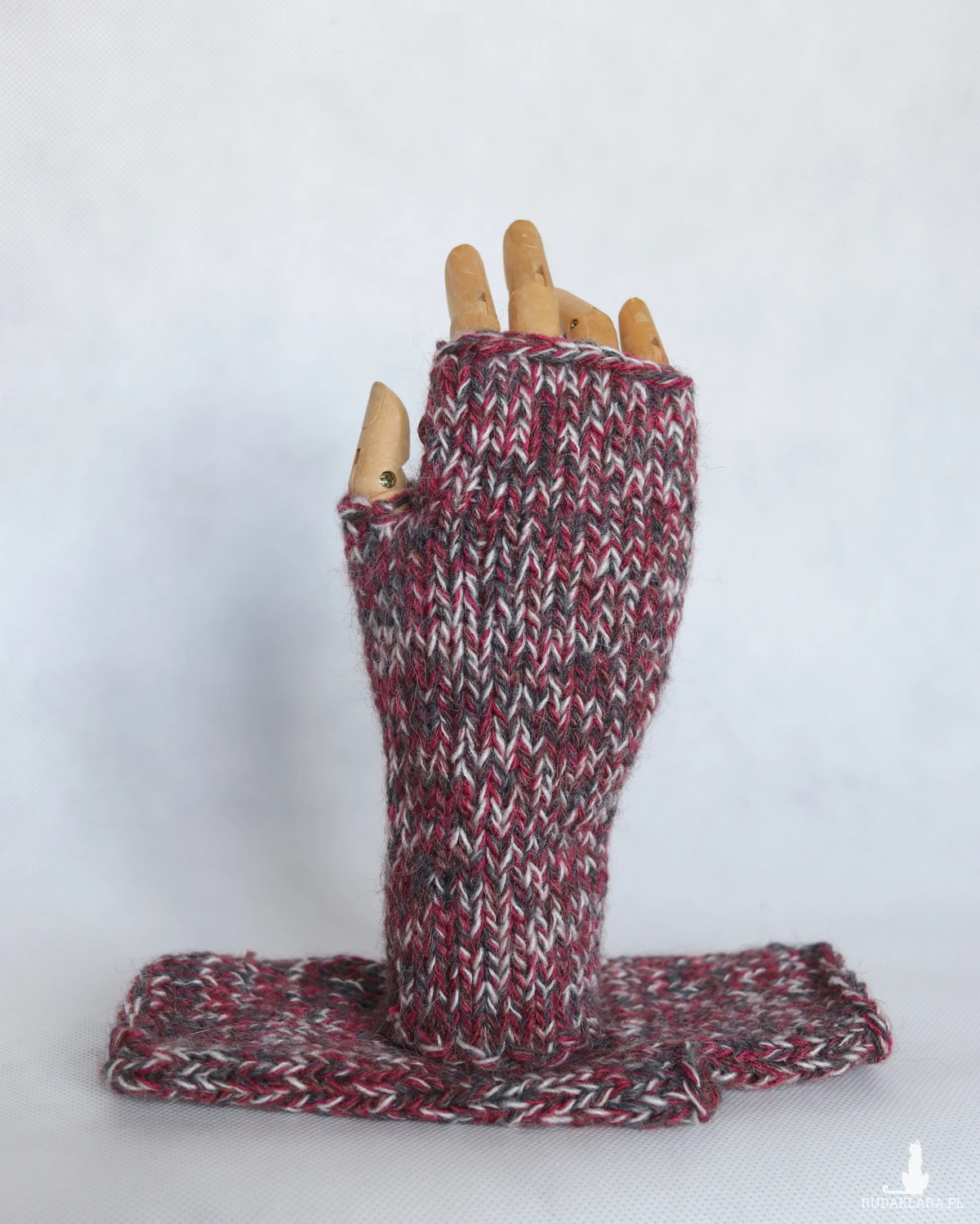 Cieplutkie bezszwowe mitenki zrobione na drutach z czterech nitek włóczki w kolorach: ecru, bordowy, grafitowy i ciemnobrązowy.