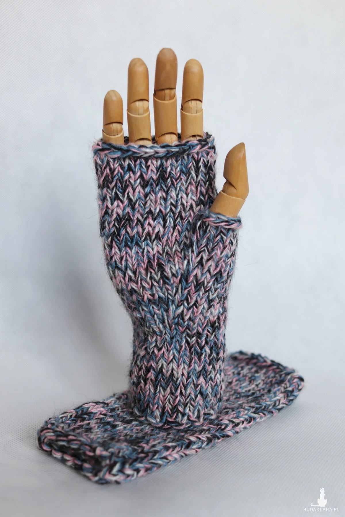 Cieplutkie bezszwowe mitenki zrobione na drutach z czterech nitek włóczki w kolorach: jasnoróżowy, ecru, jeansowy i czarny.
