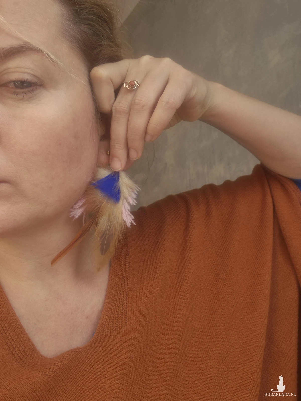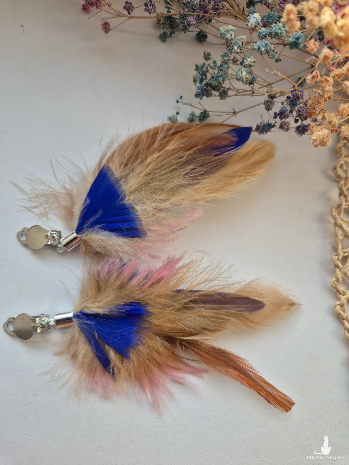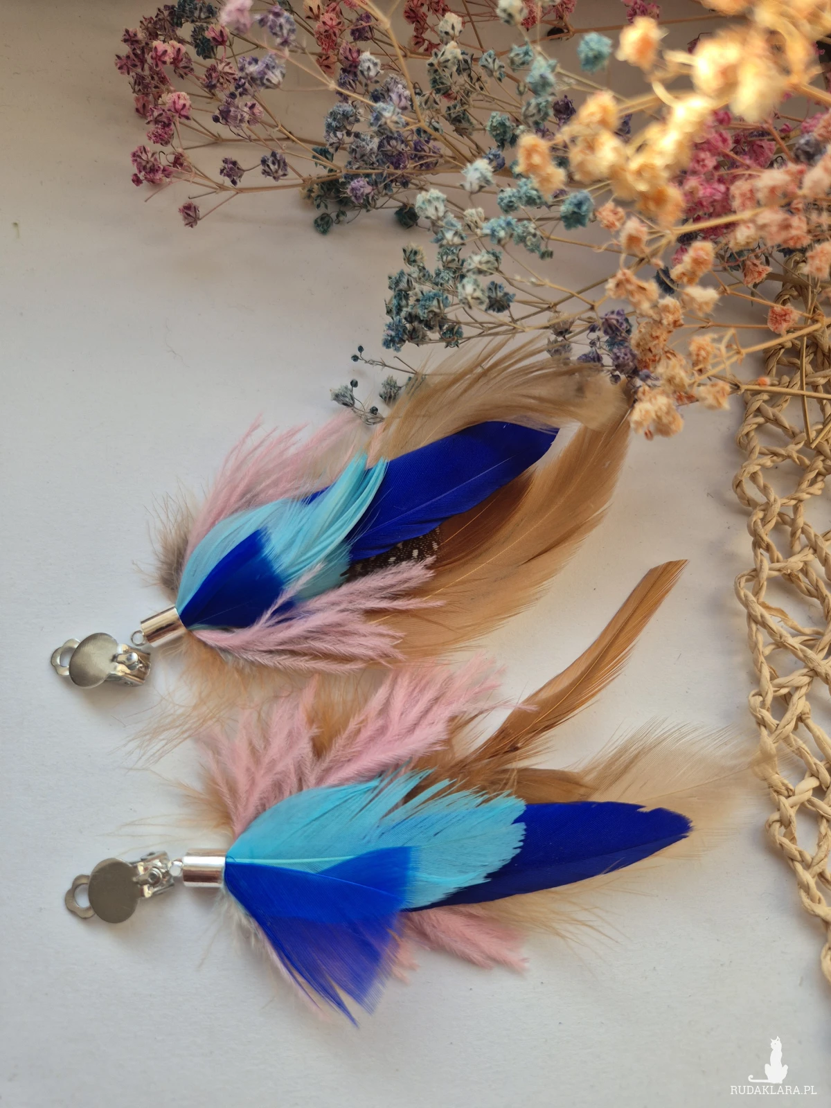 Klipsy kolorowe energetyczne  pióra duże lekkie wykonane w pojedynczym egzemplarzu rękodzieło