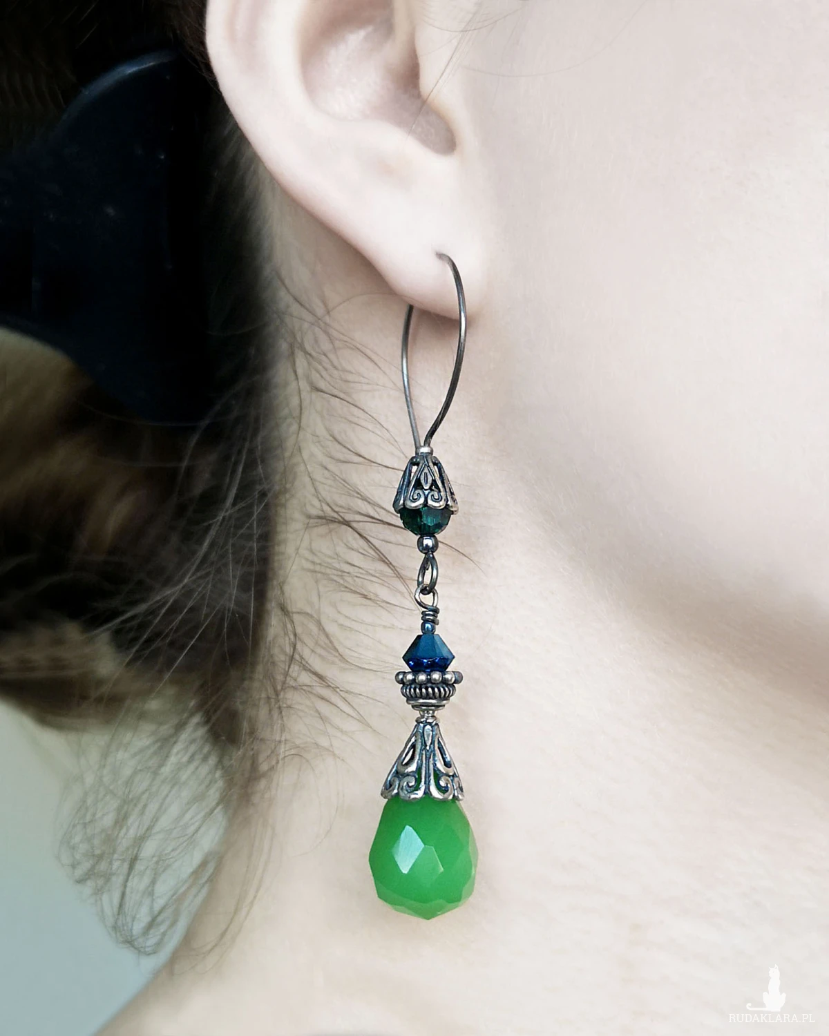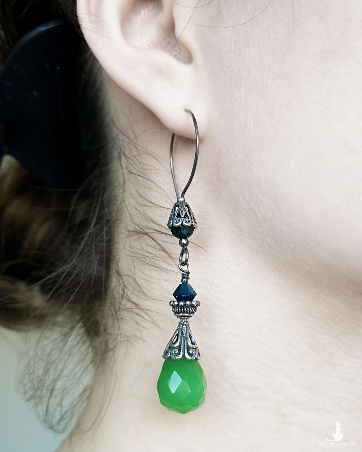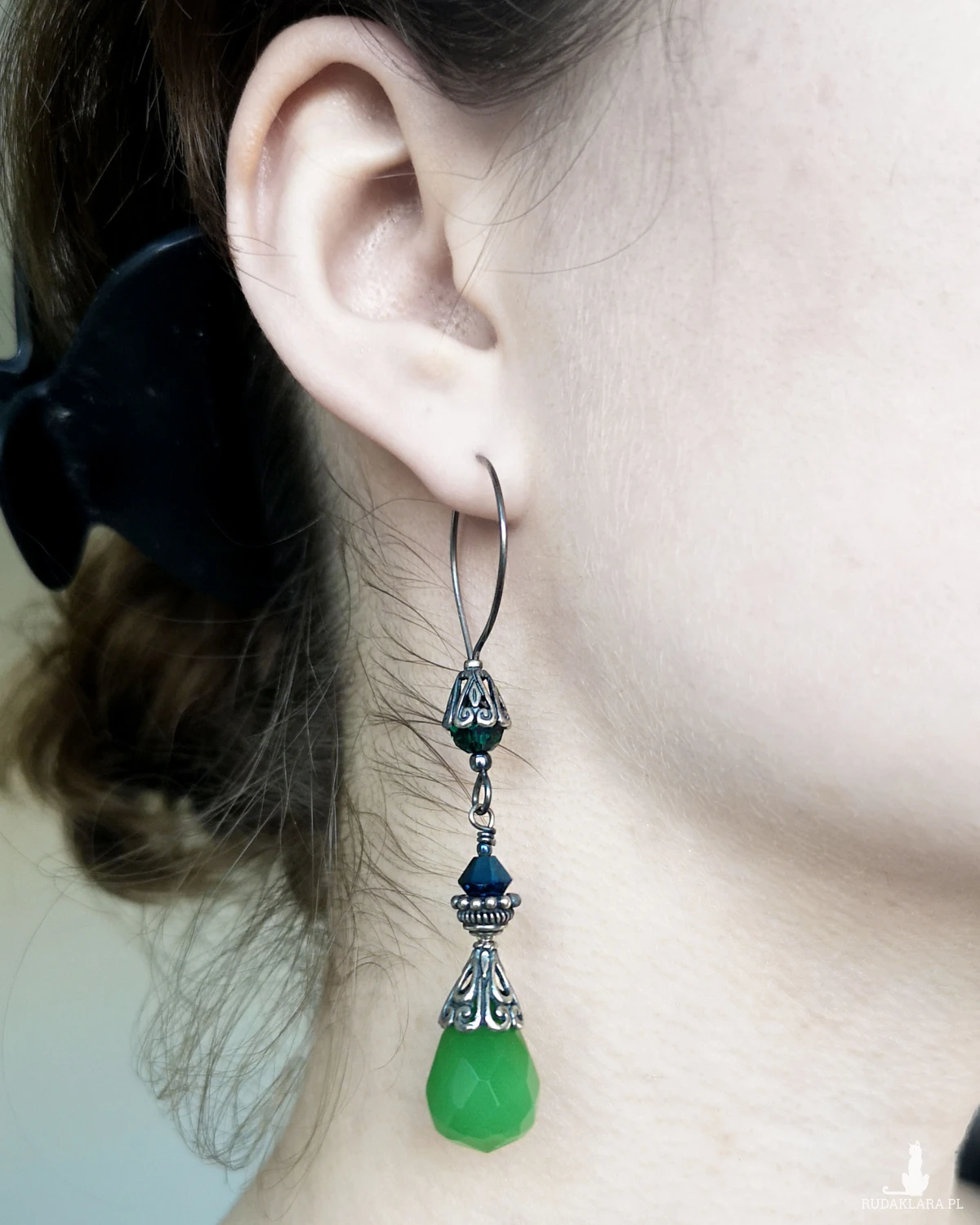 Kolczyki retro z kroplami jadeitu o wymiarach 18 x 12 mm i kryształkami w kolorze zielonym i granatowym o wymiarach 6 x 6 mm.