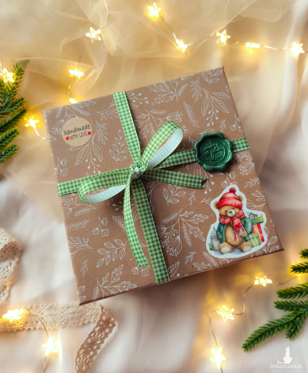 • Zestaw jest zapakowany w pudełeczko prezentowe z dodatkiem wypełnienia papierowego oraz konfetti i zawiera zawieszka świąteczna do podpisania (kolorystyka opakowania losowa), dodatkowo - wstążka dekoracyjna.