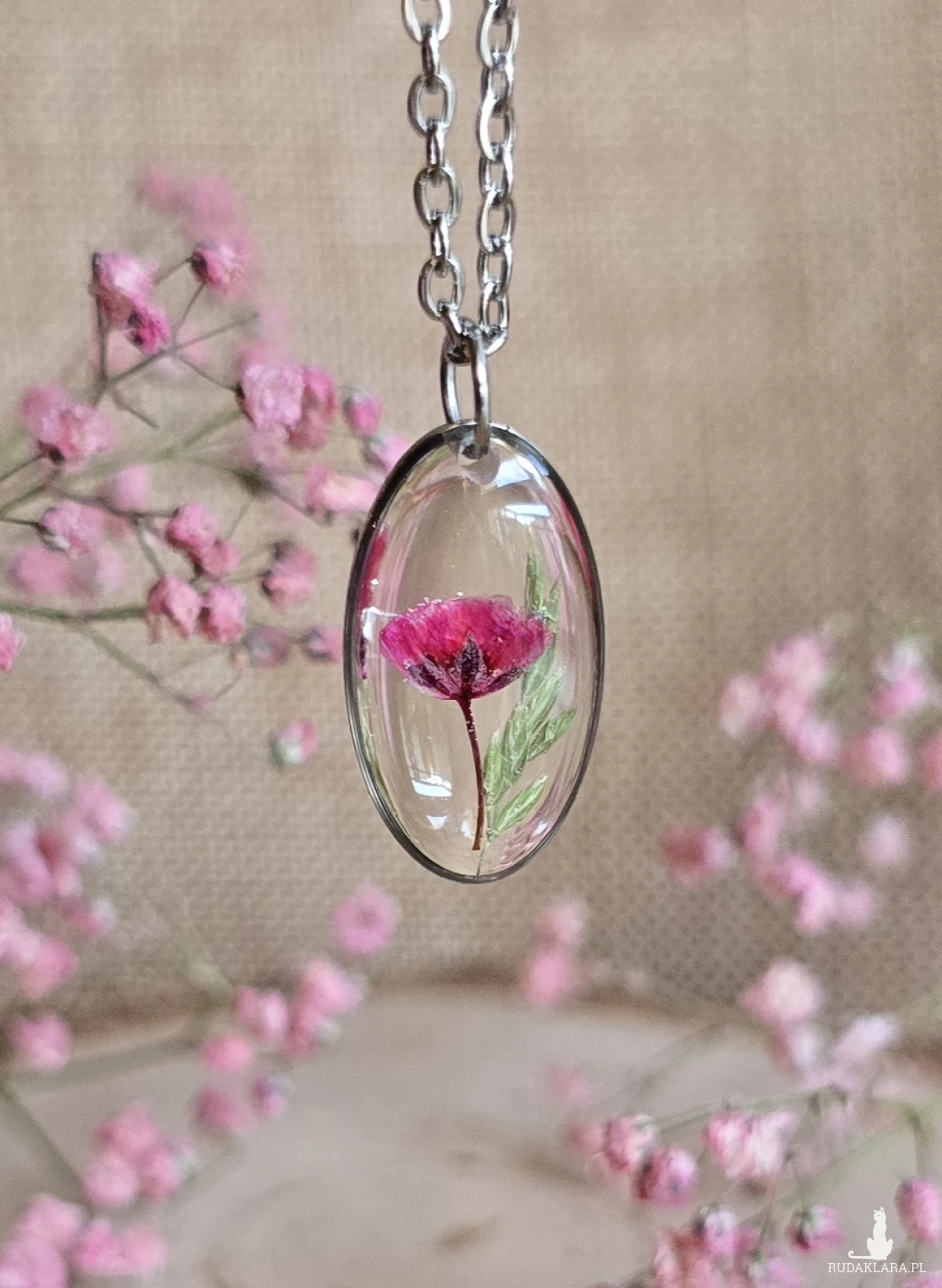 Oferuję Państwu unikalną biżuterię. Zawieszka jest wykonana z suszonych kwiatów i żywicy epoksydowej. Biżuteria jest wspaniałym i oryginalnym prezentem na lata.