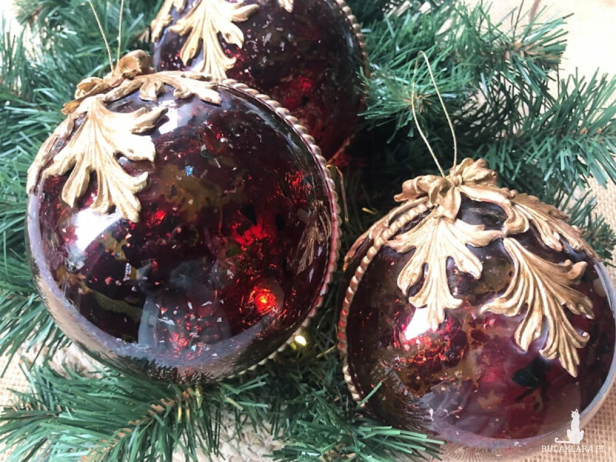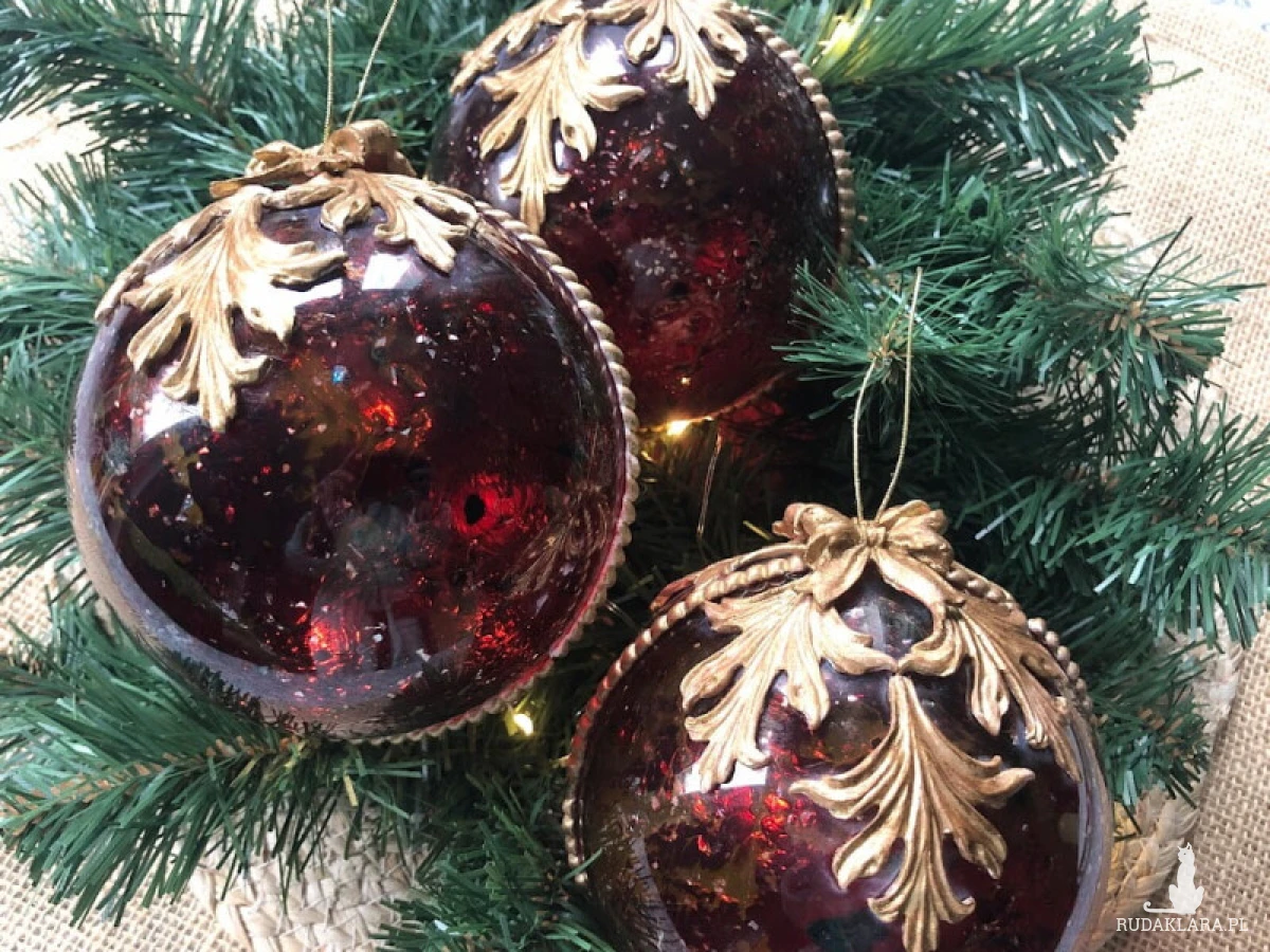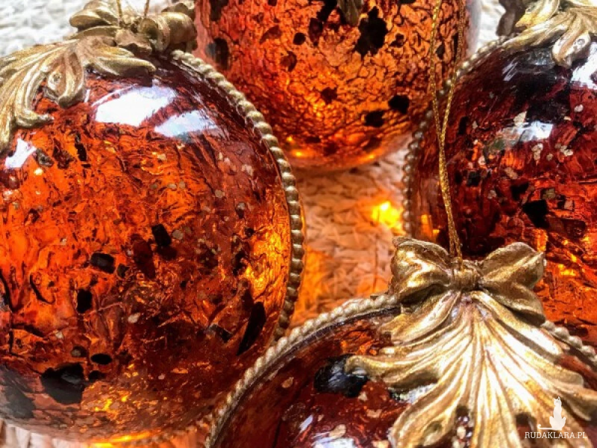 Oryginalne i bardzo efektowne bombki w imitacji bursztynu .Wykonane na kuli akrylowej o śr. 12 cm. Przyozdobione elementami sztukaterii w kolorze starego złota. To propozycja dla osób, które lubią nietypowe ozdoby świąteczne. Wykonana jest w technice mixmedia, która pozwala na uzyskanie naprawdę ciekawych efektów dekoracyjnych. Bombki możesz wykorzystać do powieszenia w oknie i oczywiście na drzewku świątecznym, które będą bardzo się mieniły podświetlane lampkami. Bombki zostały zapakowane do pudelka świątecznego,który stanowi gotowy prezent,W tej postaci produkt gotowy do natychmiastowej wysyłki.