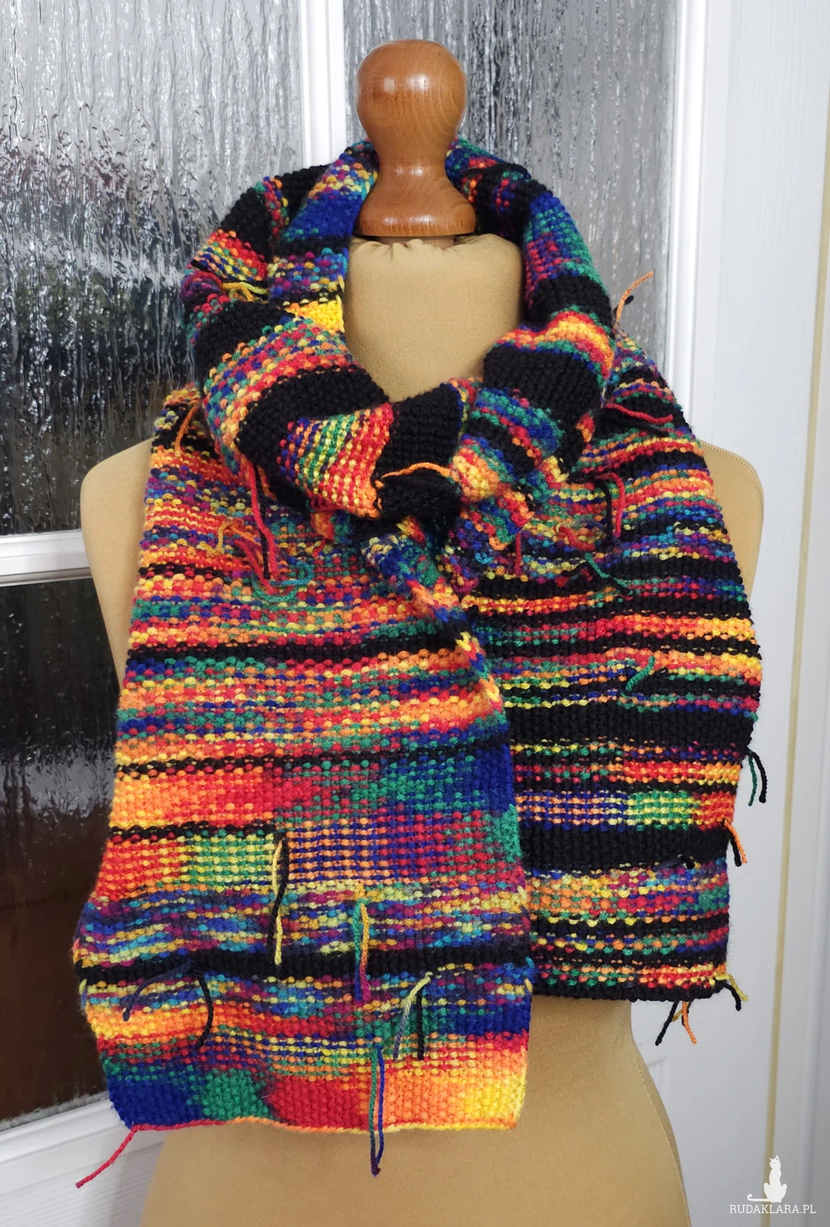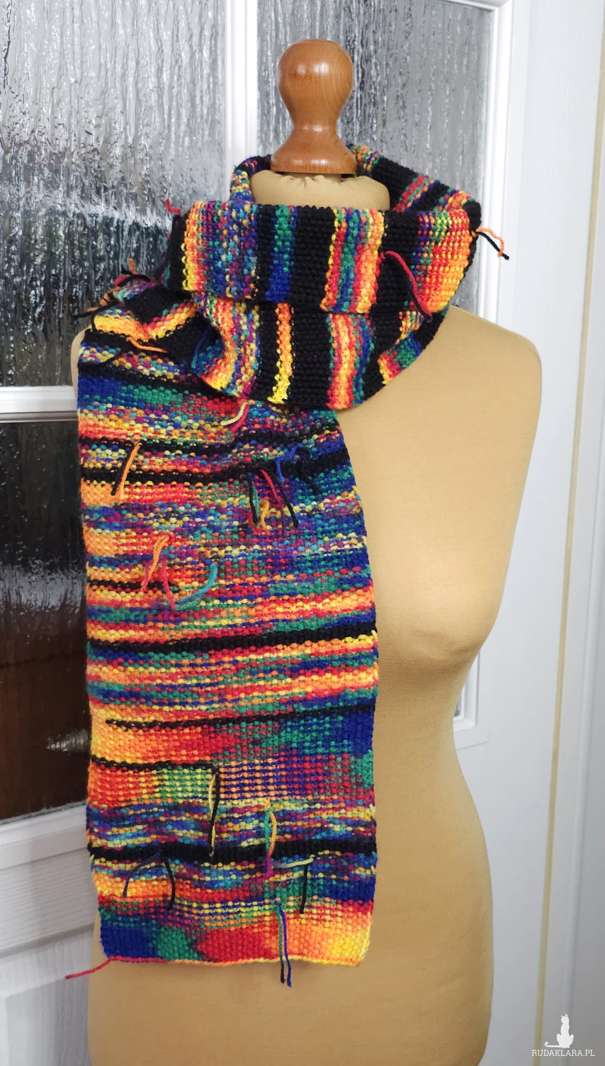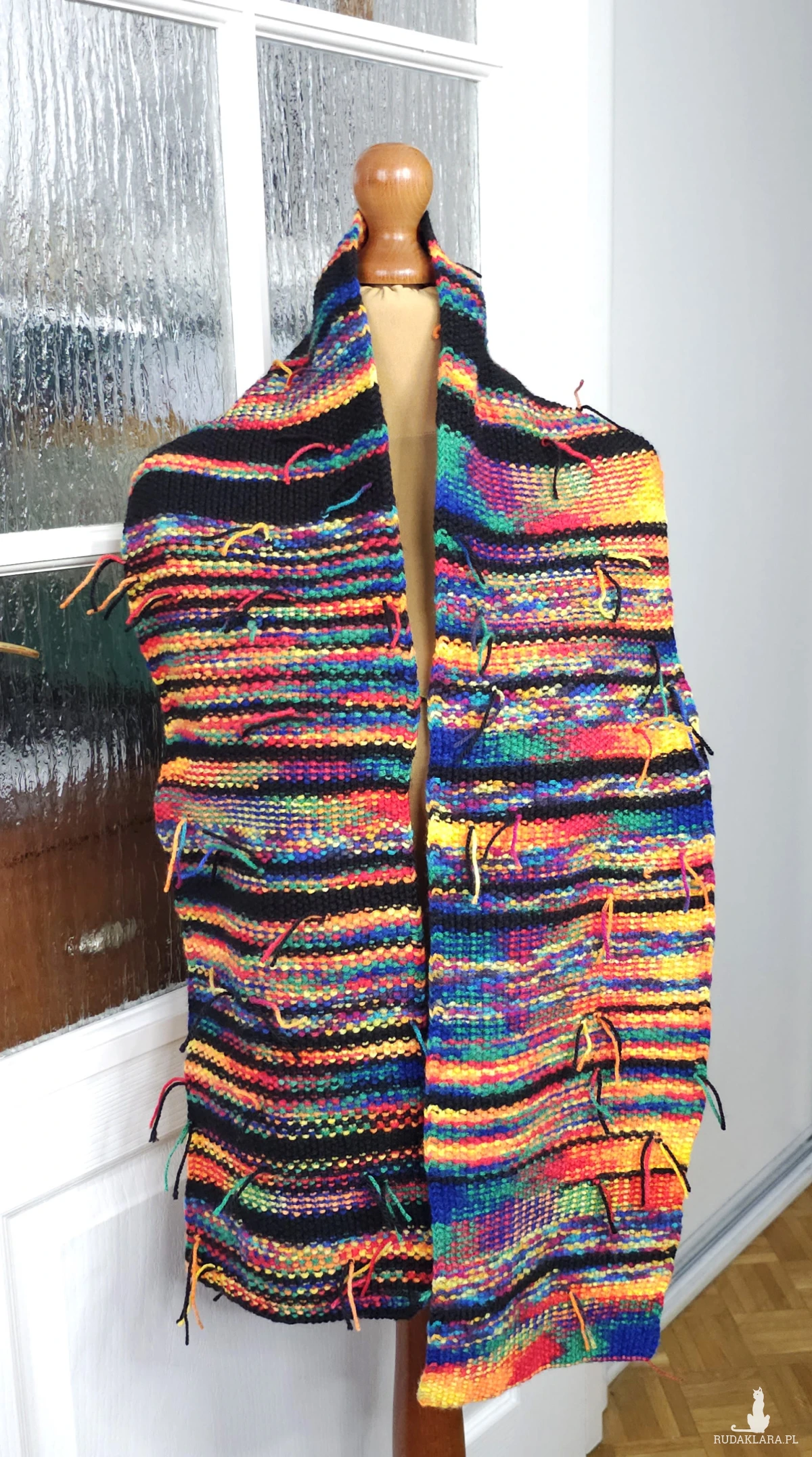 6954 Ekstrawagancki Szal Zero Waste – Ręcznie Dziany, Kontrastowe Pasy, Hippie/Boho