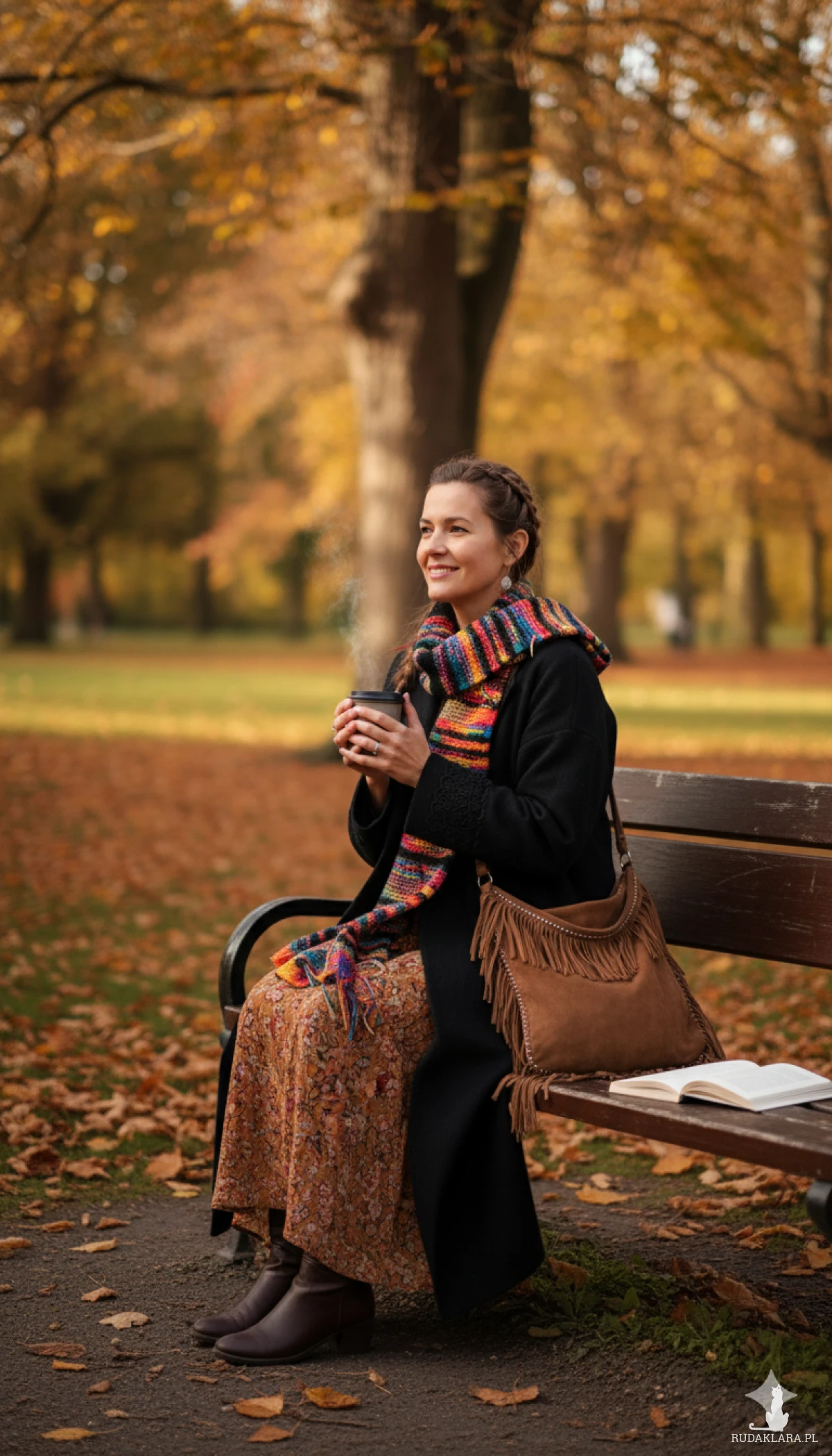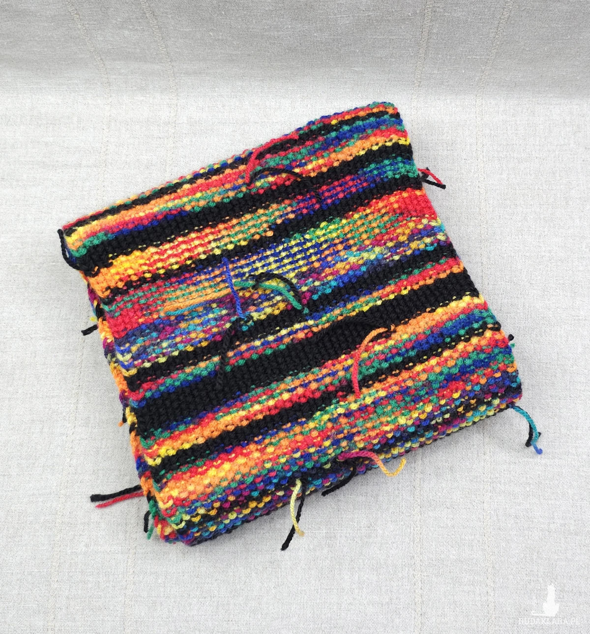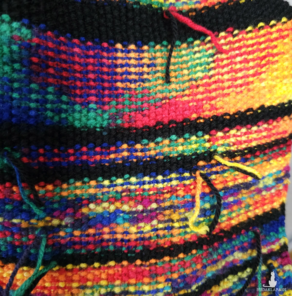 Charakterystyczne, celowo niewciągnięte końcówki nitek są kluczowym elementem estetyki, podkreślającym swobodny, rękodzielniczy styl Hippie/Boho oraz ideę, że żadna włóczka nie jest odpadem.