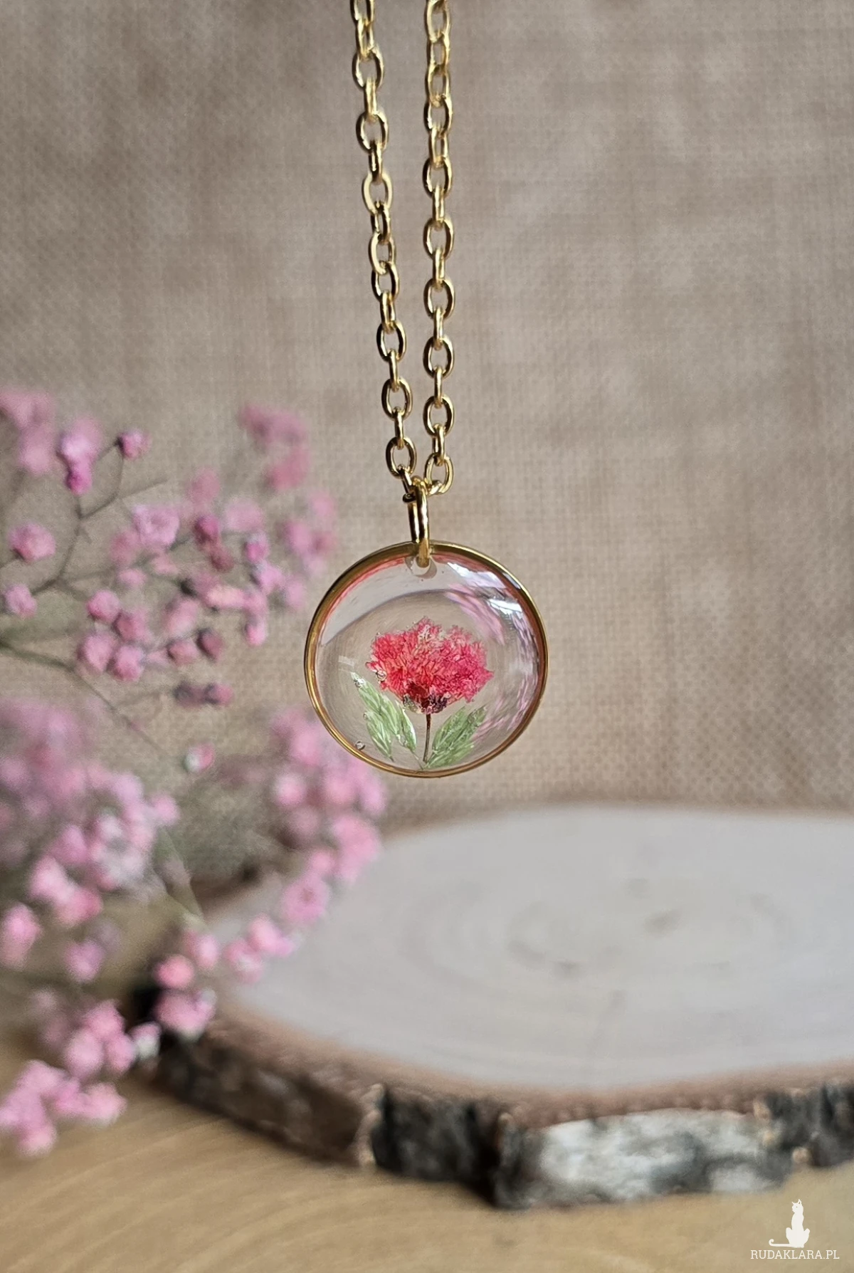 Oferuję Państwu unikalną biżuterię. Zawieszka jest wykonana z suszonych kwiatów i żywicy epoksydowej. Biżuteria jest wspaniałym i oryginalnym prezentem na lata.