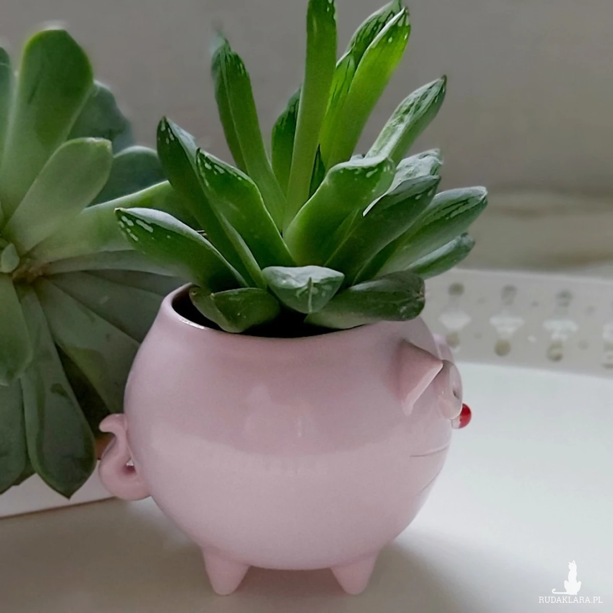 Ręcznie robiona, mała, różowa doniczka ceramiczna w kształcie kota Kiziora. Pomyśl jak może wzbogacić Twojej wnętrze i skomponować się z Twoją ulubioną rośliną.
