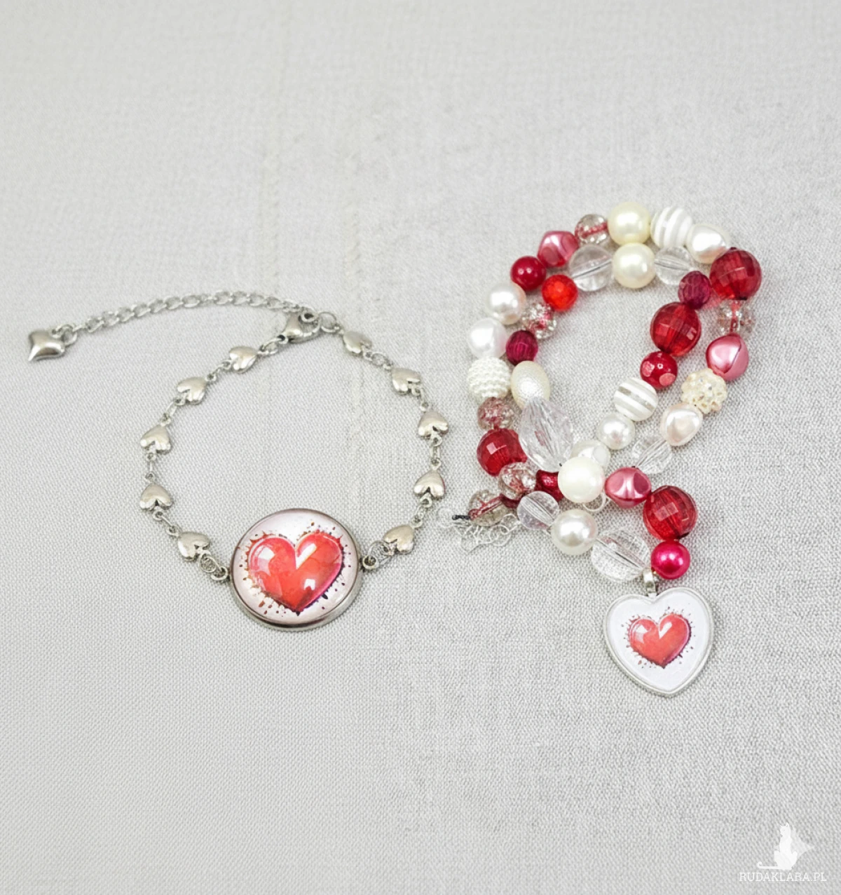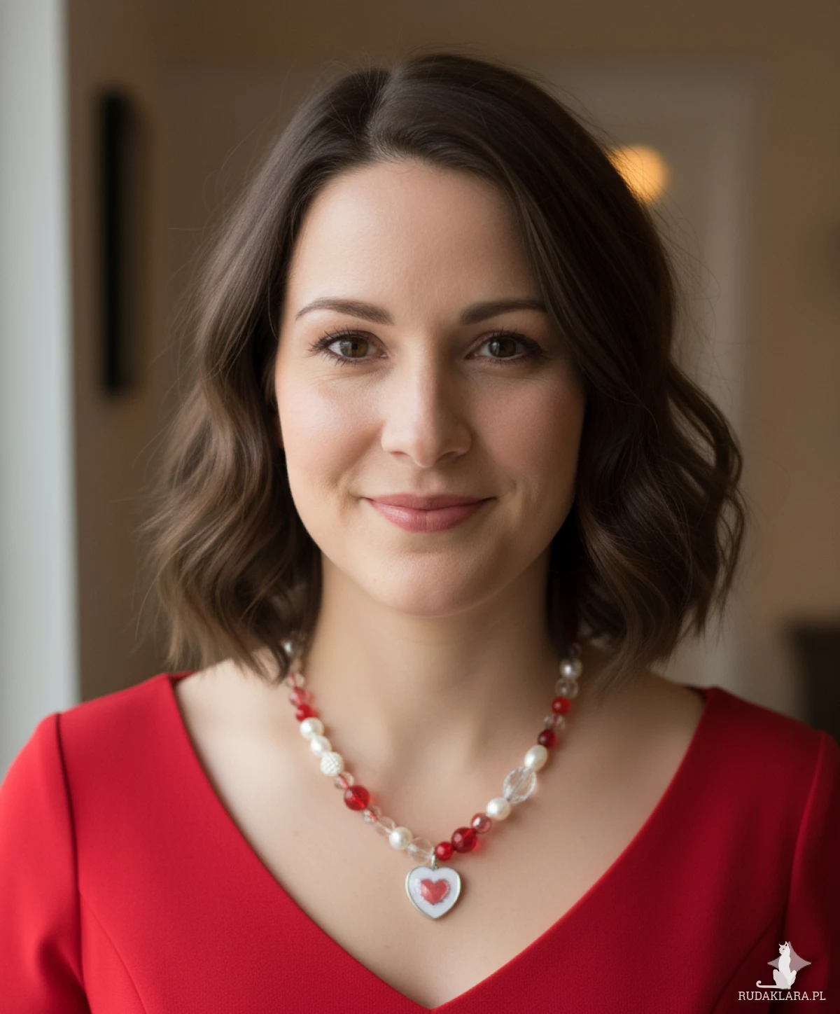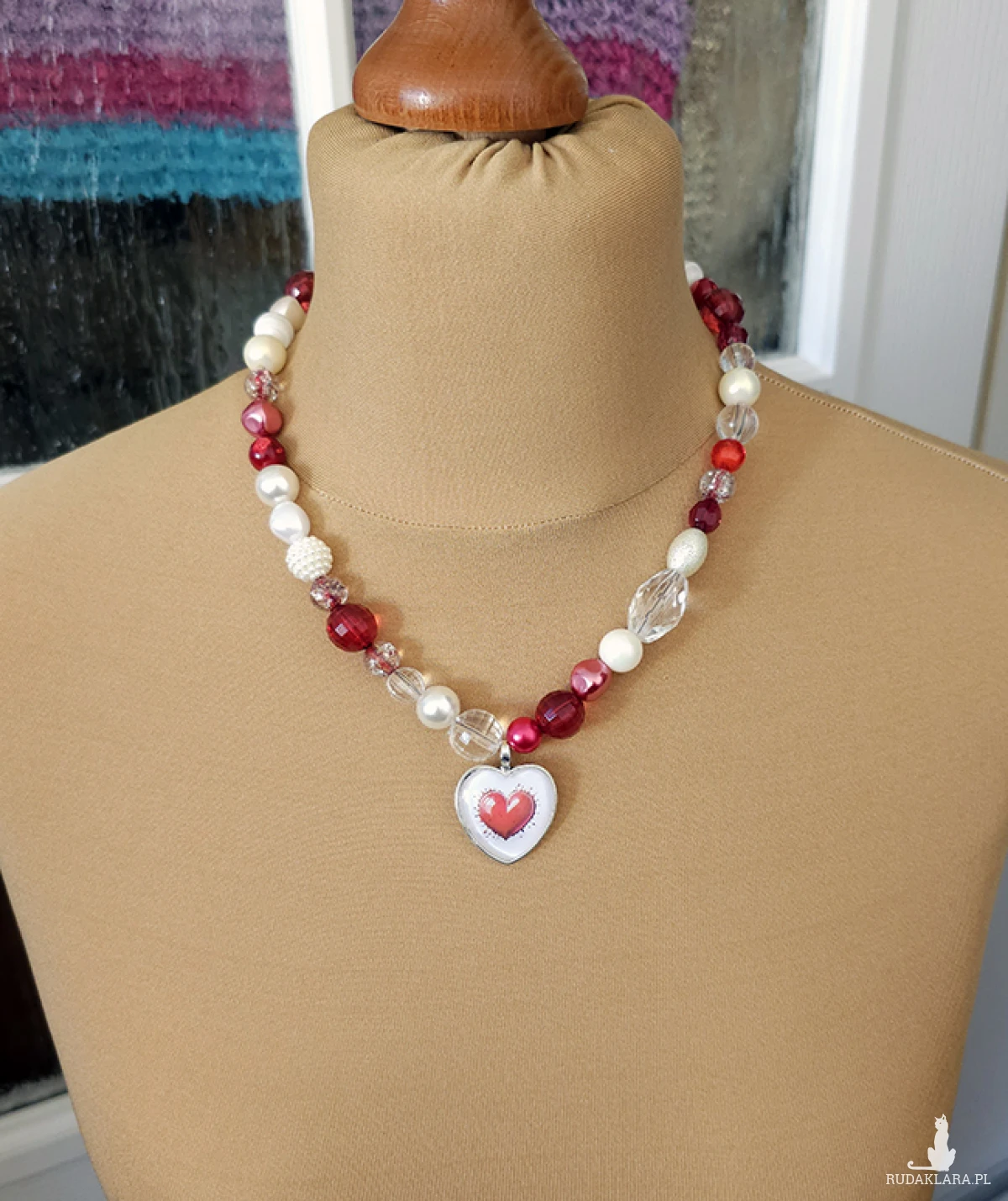 Został wykonany z bogatej mieszanki koralików w odcieniach intensywnej czerwieni oraz eleganckiej perłowej bieli i kremu.