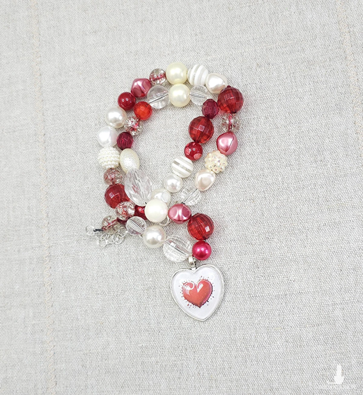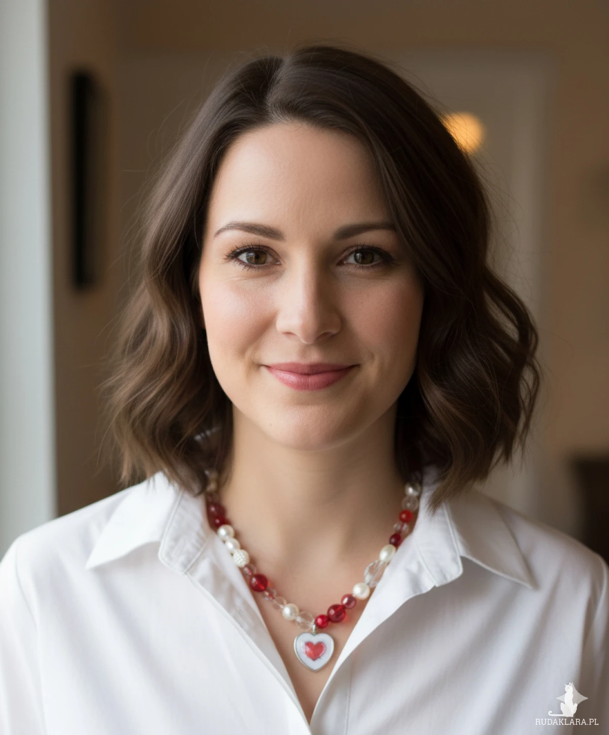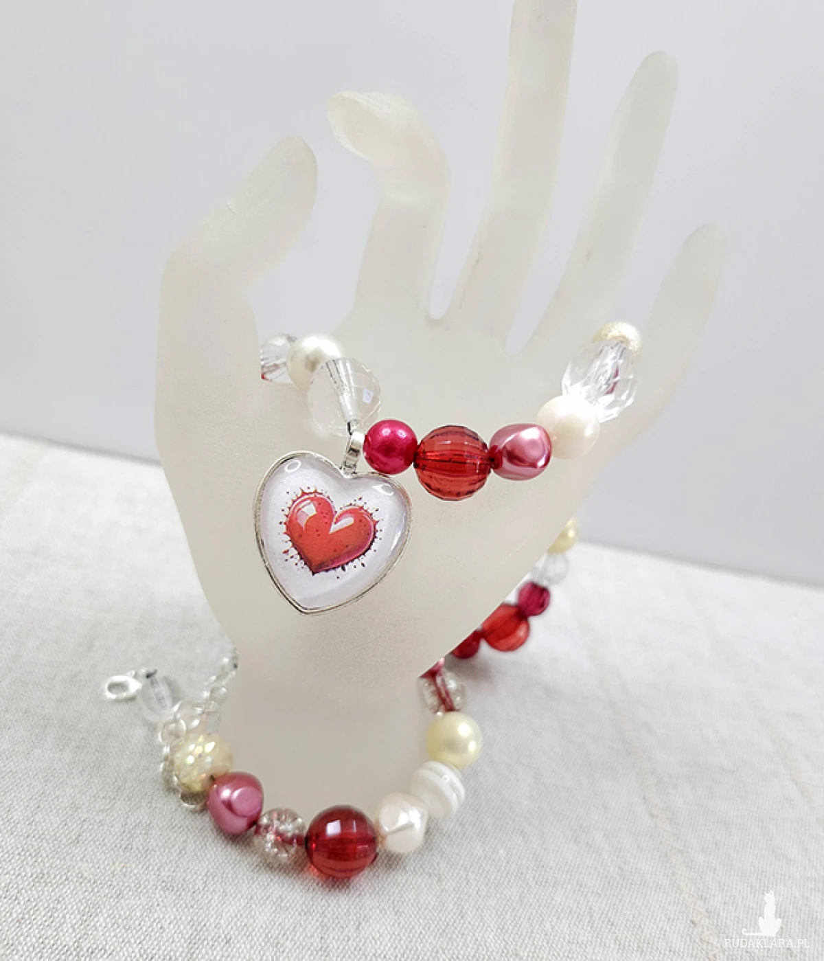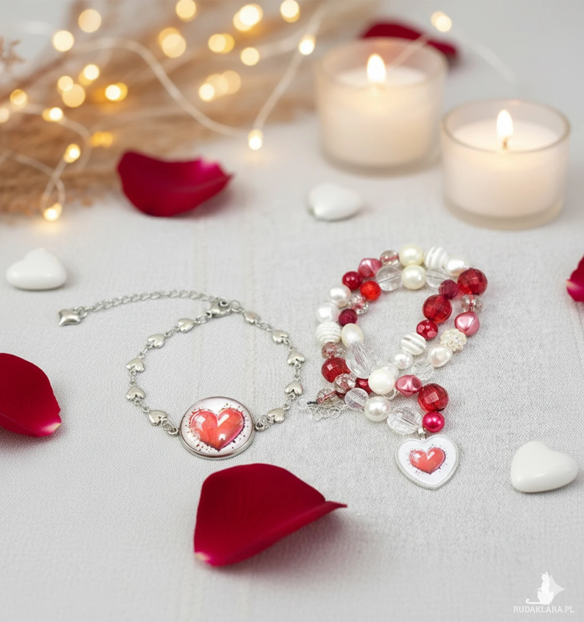 Został wykonany z bogatej mieszanki koralików w odcieniach intensywnej czerwieni oraz eleganckiej perłowej bieli i kremu.
