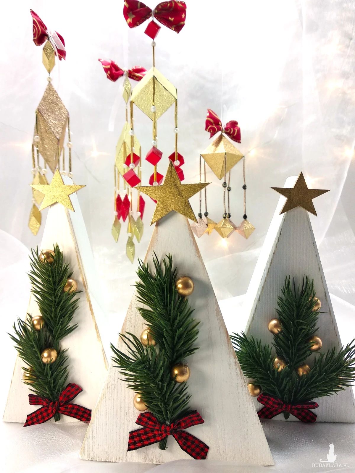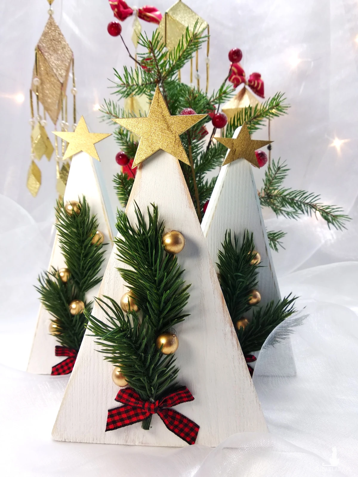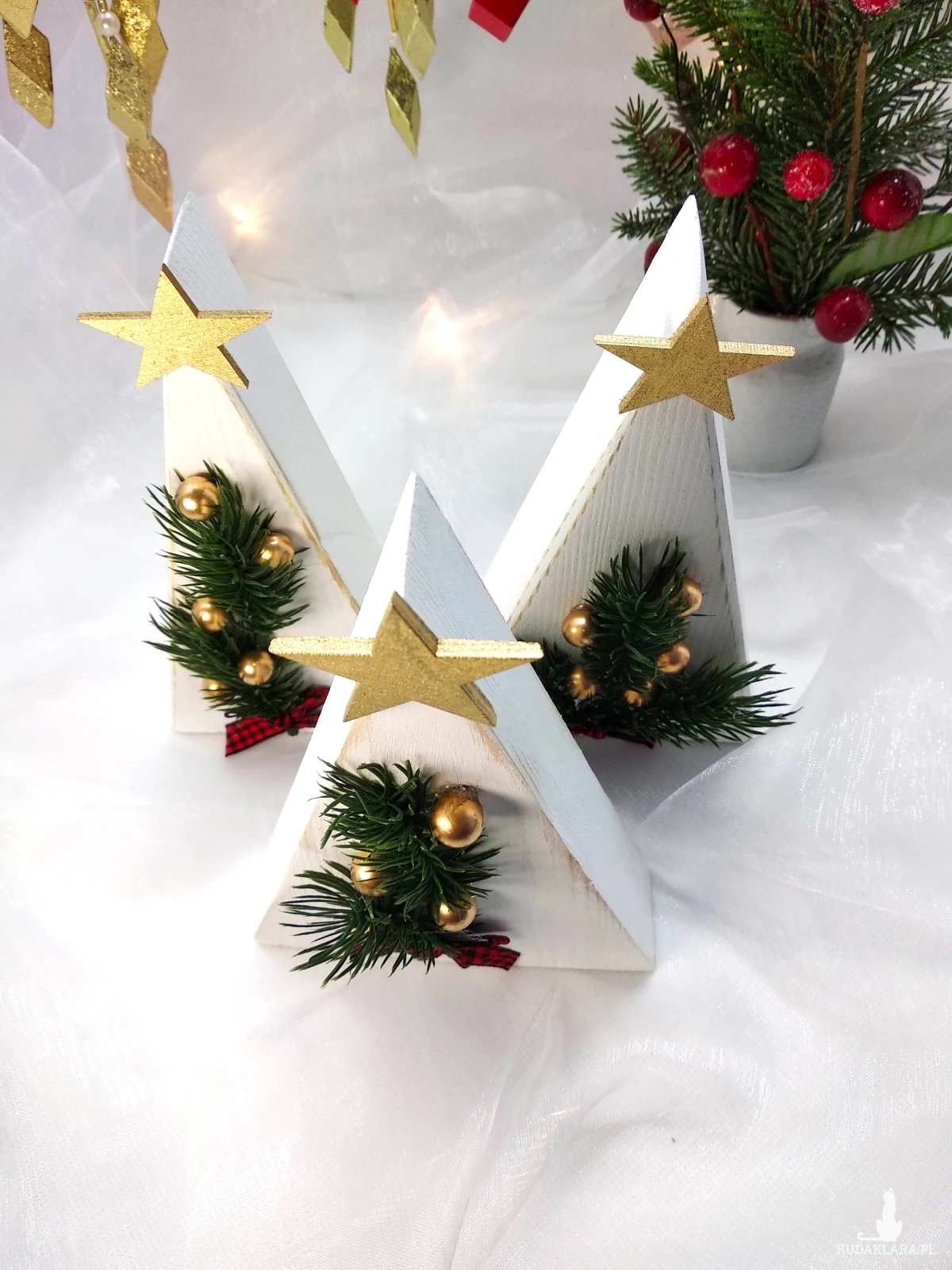 Ręcznie wykonane miniaturowe choinki to wyjątkowa ozdoba, która wprowadzi do Twojego domu świąteczną atmosferę. Każda choinka została starannie wykonana z drewna i ozdobiona sztucznymi gałązkami świerku, złotymi kuleczkami oraz elegancką, czerwoną kokardką. Idealne jako dekoracja stołu, komody czy półki. Pięknie prezentują się na parapecie okna ozdobione małymi światełkami. Mogą być częścią większej kompozycji np. postawione wśród domków śnieżnych z moich innych aukcji.