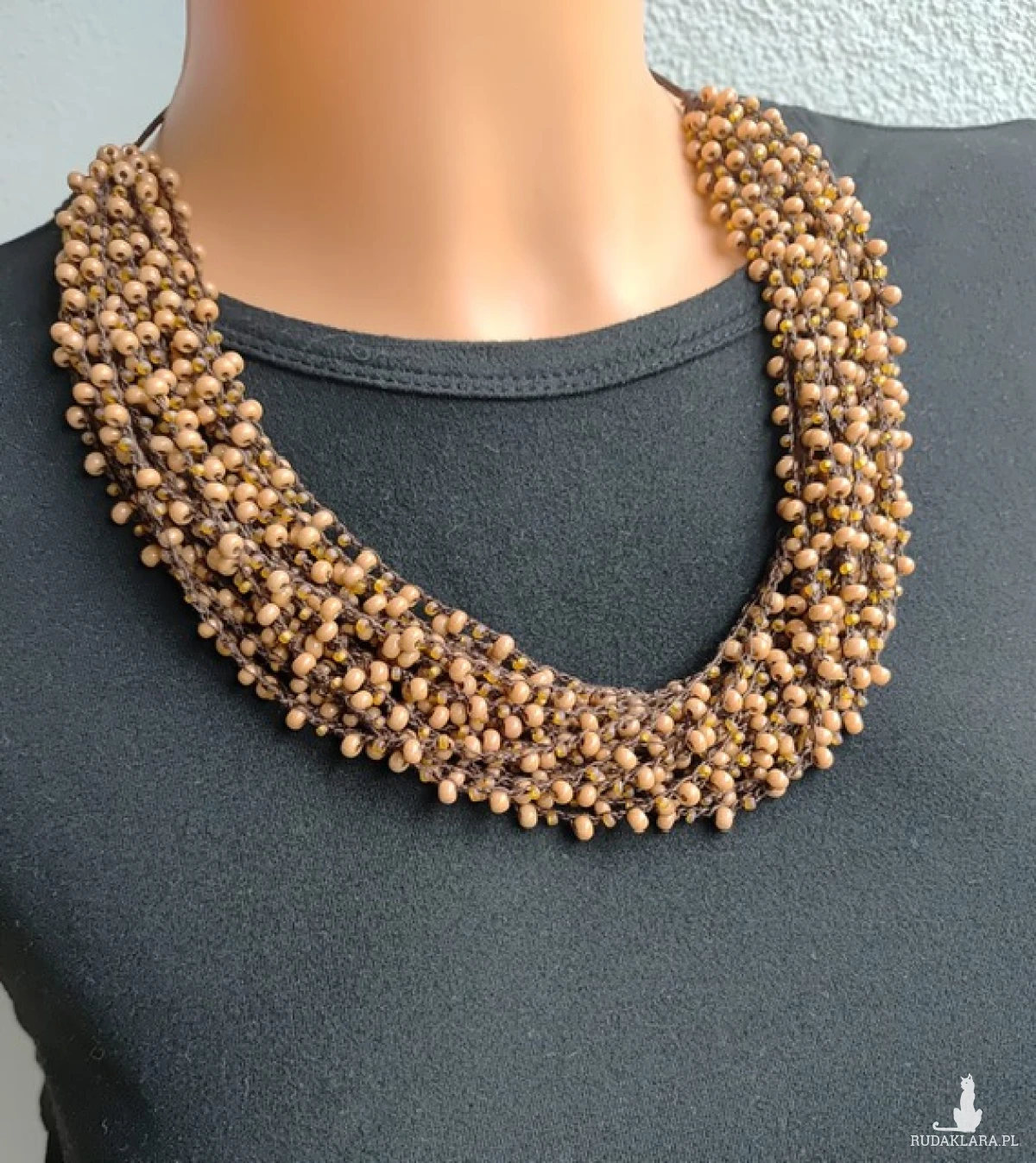 kolorze karmelowym. Naszyjnik lekki mimo dużej ilości koralików,