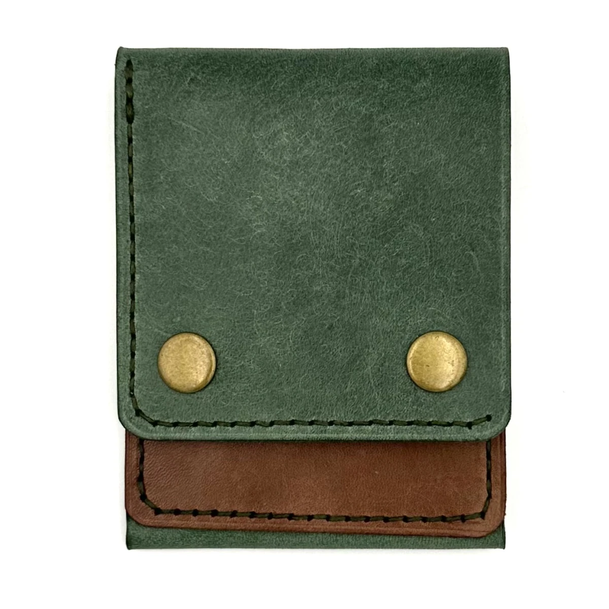 Portfel w kolorze na zewnątrz zielonym w środku brązowy. Nici koloru zielonego.