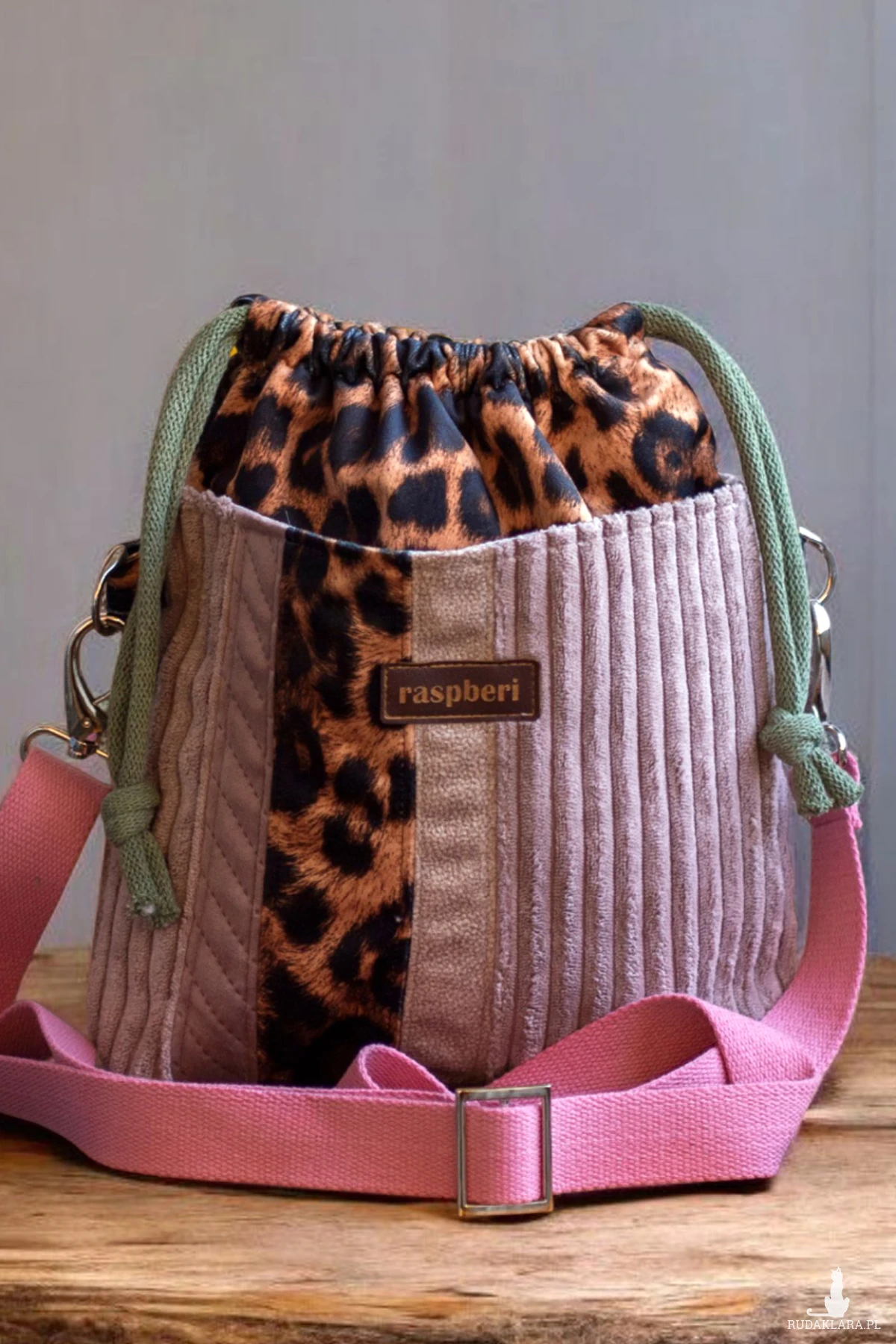 Wykonana z weluru w panterkę. Z przodu oraz z na tyle torebki kieszenie (np. na telefon czy chusteczki) z pudroworóżowego grubego sztruksu, pikowanego weluru, weluru w kolorze beżowym oraz weluru w panterkę. W środku kieszonka zapinana na suwak.