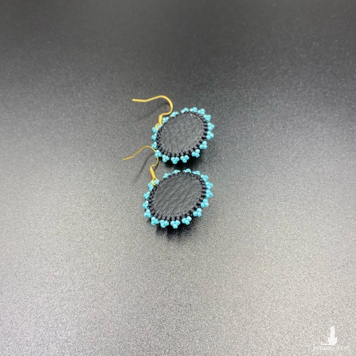 Okrągłe, małe kolczyki wykonane zostały techniką haftu koralikowego z drobnych koralików Toho i Miyuki, w 100% wyszyte ręcznie. Spód kolczyków podszyty jest czarną eko skórką. Bigle otwarte ze stali chirurgicznej w kolorze złotym.
