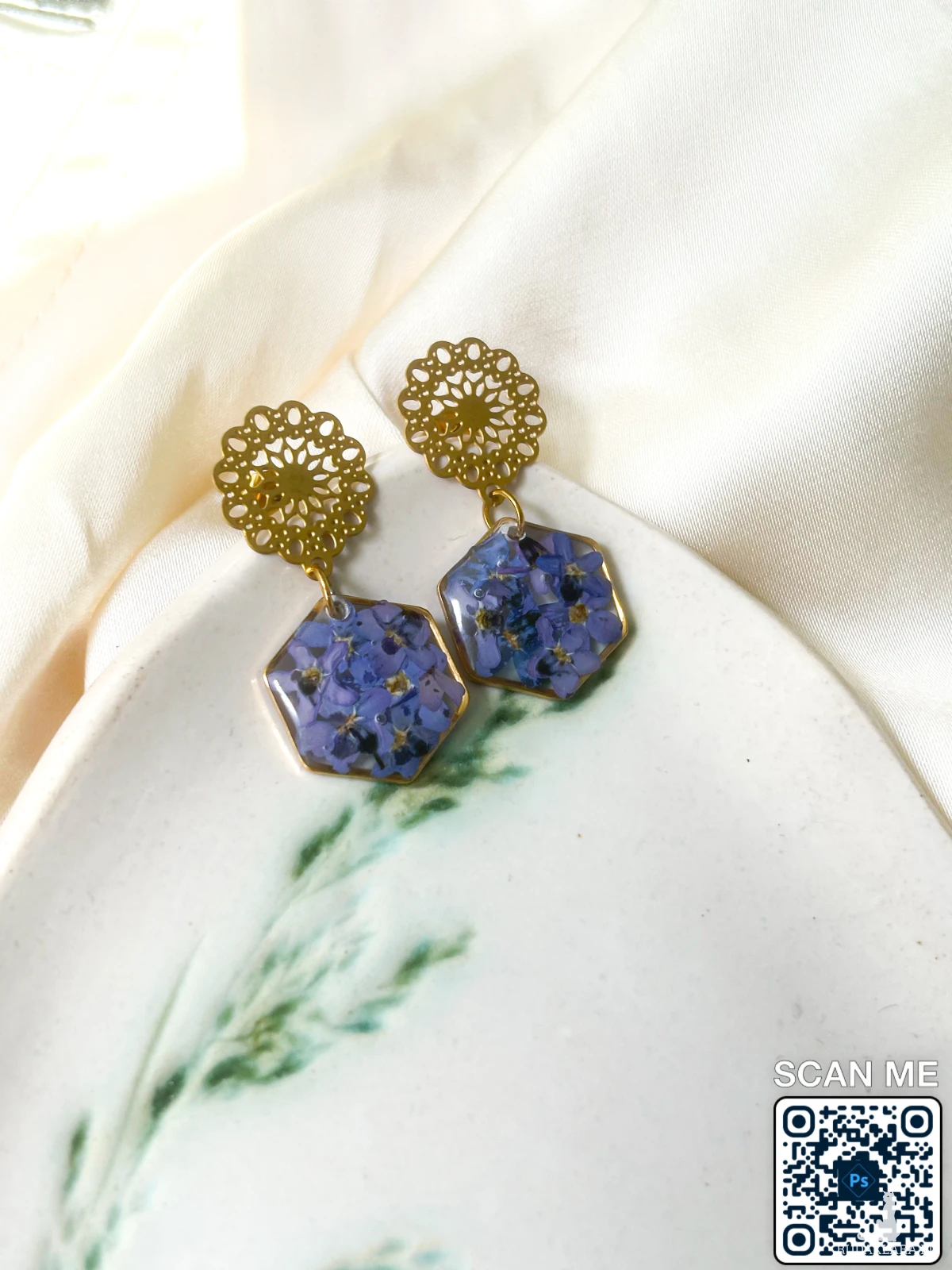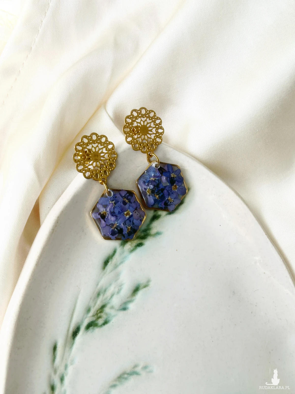 Piękne kolczyki z niezapominajkami zamkniętymi w żywicy.