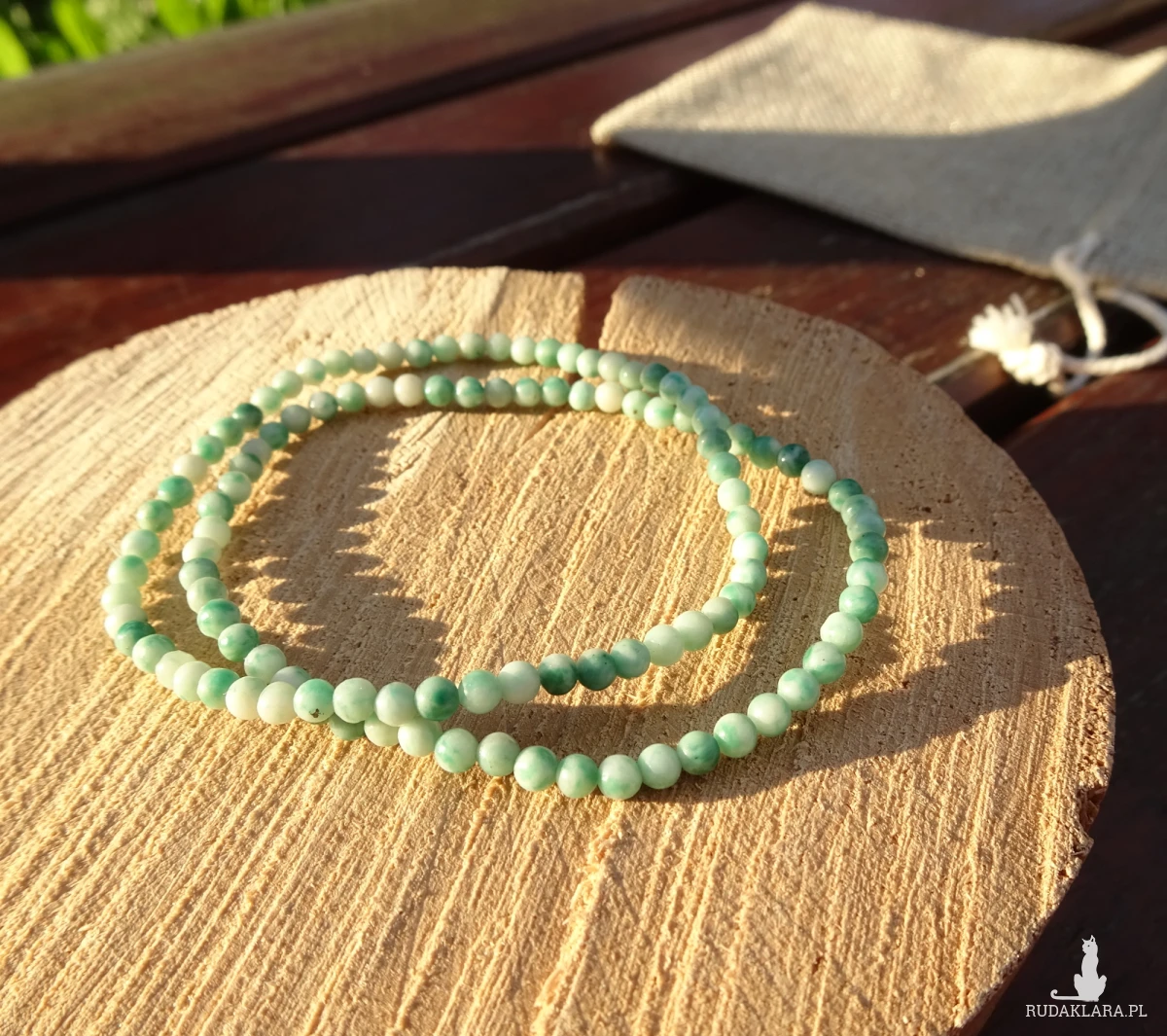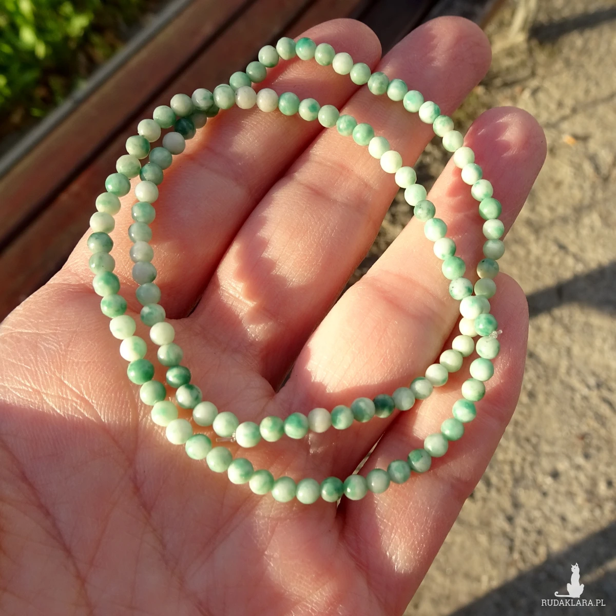 Bransoletka z gładkich kulek naturalnego zielonego jaspisu plamistego wielkości 3 mm, na silikonowej gumce.