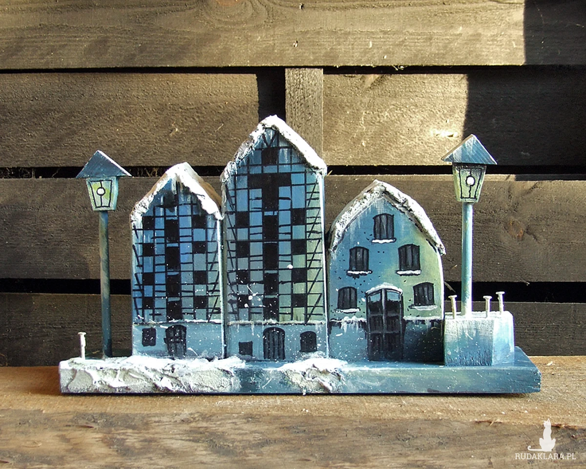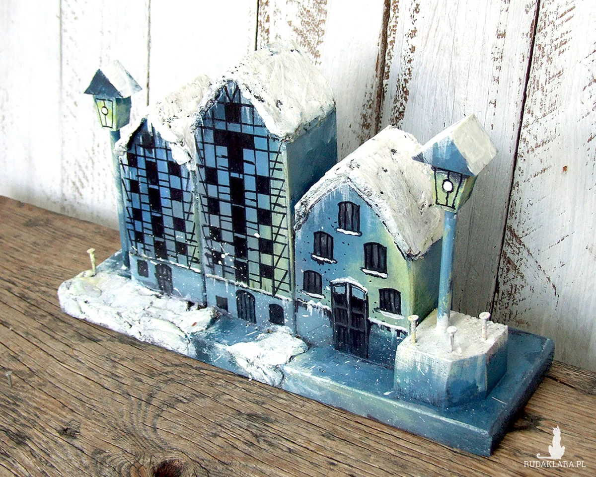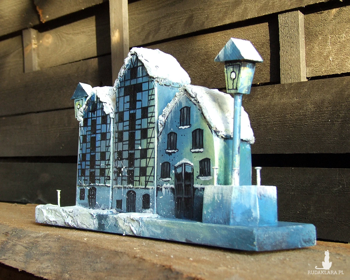 Zimowe Spichrze - dekoracja z drewna, ręcznie malowana, inspirowana trzema spichrzami w Bydgoszczy.